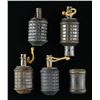 Included in this group is 1 Type 10, 3 Type 97 & 1 Type 99 w/out plug or fuse. This selection of iron grenades measure about 2 1/2" in length w/ 2" diameter w/ 4 having top caps & fuses. 3 Grenades have pins w/ string cords. CONDITION: fair to good overall w/ oxidation, handling marks, & dents throughout commensurate w/ age. (02-16272-2/MD). $350-500.