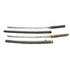 3) KATANA. Overall length: 37". Blade length: 26". Blade has an irregular wavy hamon & a brass habaki. There are 2 seppa, but no tsuba. Nakago has an 8 character signature on both sides & one side also has a white painted signature. There is a single mekugi-ana. Matching fuchi & kabuto-gane. White same with olive green tsuka ito. Matching cherry blossom menuki. The saya is black painted wood covered in leather. CONDITION: blade is in fine condition but in need of a polishing. Tsuka shows light to moderate wear with the kabuto-gane showing heavy wear. Saya appears solid but leather covering is deteriorated.