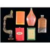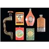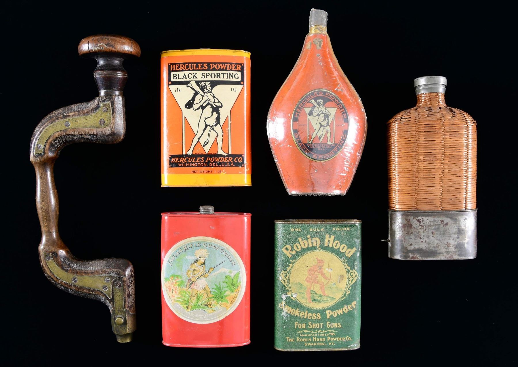 Hercules Black Powder tin having yellow base & orange label. / Indian Rifle Gunpowder tin with red base & Dupont label on back. / Robin Hood Smokeless Powder tin with green base paint. / Hercules Black Powder tin with Orange base paint (tin covered in cellophane). / Unmarked tin with steel cup base & wicker covering over body. / Unmarked hardwood bit brace with brass reinforcements. CONDITION: tins in good overall condition with Robin hood tin shows significantly more wear. Bit brace in fair condition with large split in head along with nuermous marks throughout handle. PROVENANCE: from the renowned collection of quality sporting arms from Lewis Drake together with inventory of Lewis Drake Associates. (02-23572/MD). $200-300.