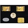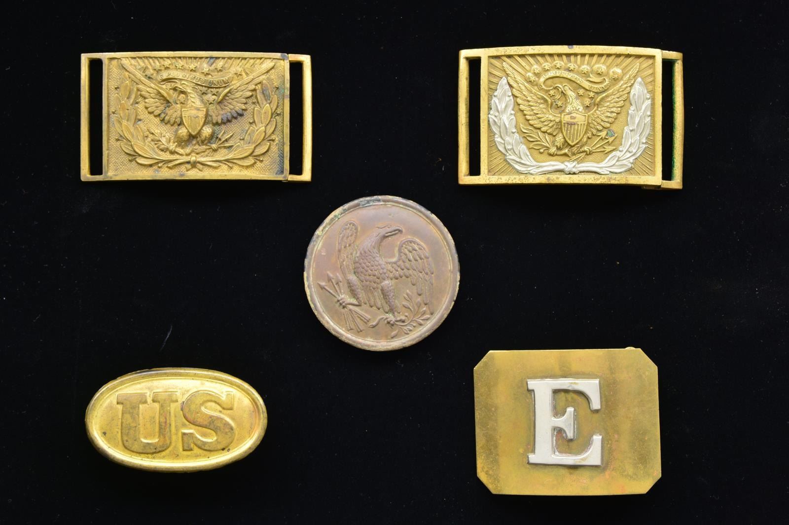 & PLATES. This fine lot includes 1 early Civil War M1851 sword belt plate with a mismatched, but well fitting, keeper. Buckle is gilded brass with a spread wing eagle on the front & applied silver wreath. The reverse has a narrow tongue. / 1 Late Civil War M1851 sword belt plate with the original keeper. Buckle is gilded brass with a spread wing eagle on the front engulfed by a swag of laurel leaves. The reverse has a medium tongue. / 1 Excavated NCO 3 hook cross belt plate. The face has a chocolate brown patina & features a droop wing eagle. The reverse has 3 heavily rusted, but extant, hooks. / 1 US M1839 small box plate. The face is gilded brass with a central “US” in an oval. The reverse has 2 iron loops & is clearly stamped “W.H. SMITH BROOKLYN”. / 1 Post Civil War militia buckle of gilded brass with clipped corners. There is a silvered large letter “E” on the front. The reverse has a wide tongue. CONDITION: all plates show light wear except as noted above. (02-18164/BF). $900-1,200.