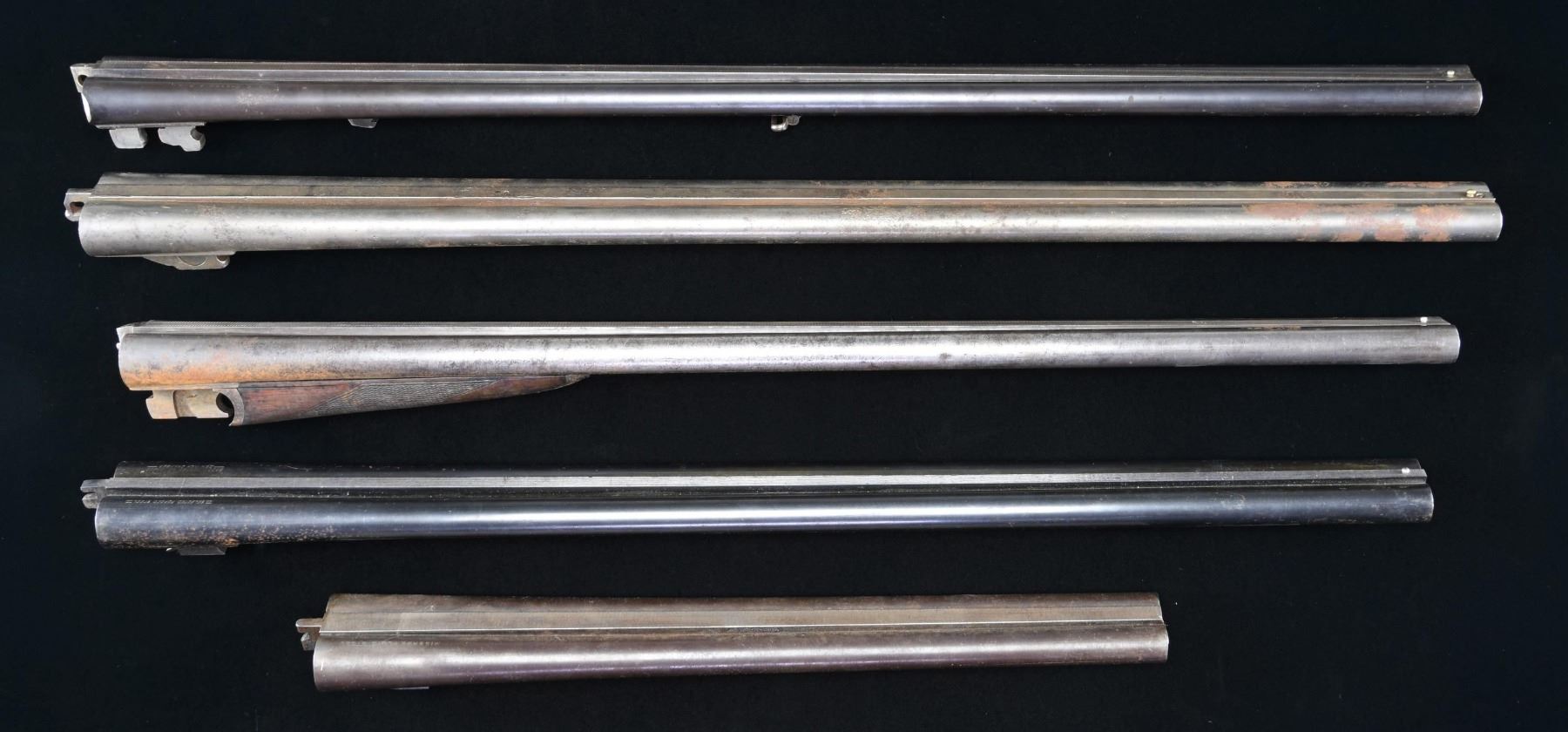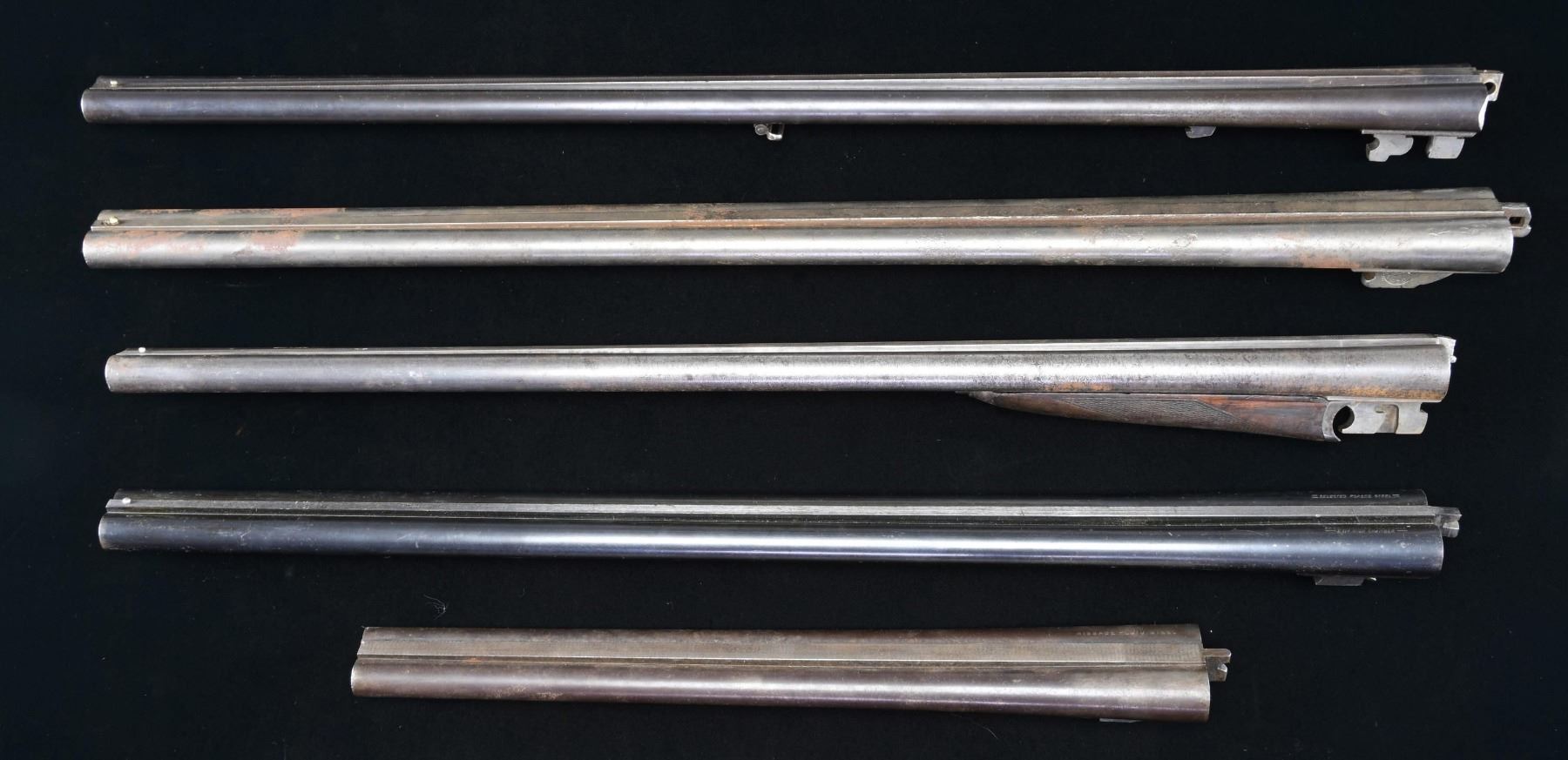 Cal. 12 Ga. (first 4) and 16 Ga. (#5). 1). 17 3/4" MISSABE Fluid Steel #6939. Poor to fair with fair to good bores. Not legal length for use other than decoration. 2.) 30" Damascus without markings. #92550. Poor overall with fair bores. 3). 28" Damascus without markings. #112068. Includes fair matching numbered push button release forend. Cleaned finish with light oxidation at rear. Very good plus bores. 4). 28" blued in good condition having caliber markings of American style. Under side of lug has "47", "V1" plus circled "A" and "E". Near excellent bright bores. Scattered light oxidation on exterior. 5). 29 5/8" Cal. 16 Ga. E. GROTHE & SOHN #16621 blued barrel set (with sling swivel) marked "Flussstahl-Krupp-Essen". Top of left barrel marked "Stendal". Dated 9/27 plus "Nitro", Crown U and other Belgian proofs. Barrels made for side clips. Light occasional oxidation on exterior. Good to very good bores. (02-23423/NW). $200-400.