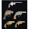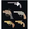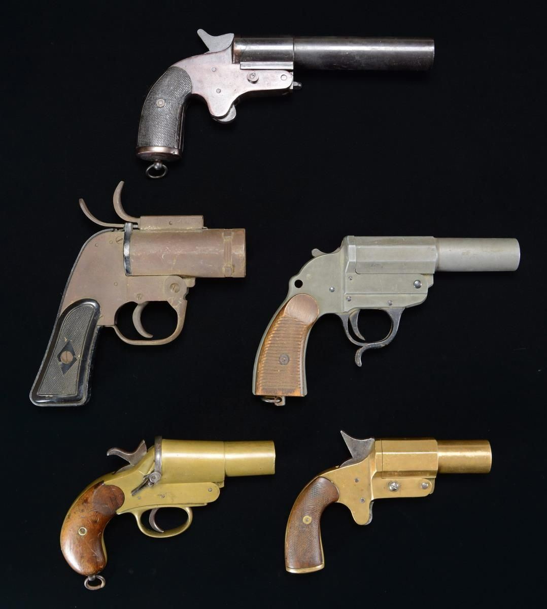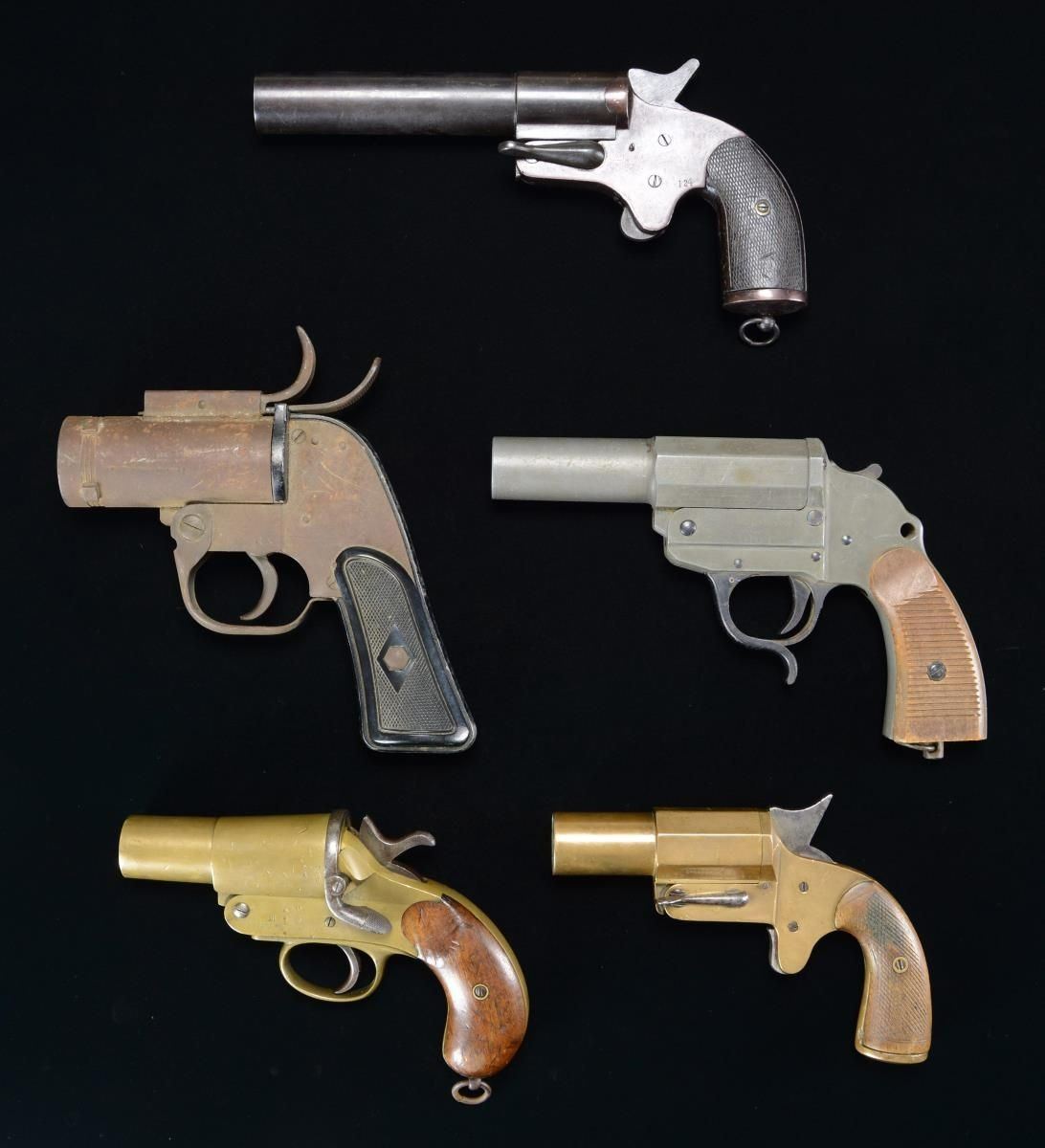 1) FRENCH. A WWII era French flare pistol with a brass body. The pistol has an iron hammer, trigger, & release mechanism. There is a spot at the butt for a lanyard ring that is missing. 2-Piece wood grips. The lower facets of the barrel are marked “CHOBERT_PAR'S” & “16.RLE LAFAYETTE”. The underside of the frame is serial numbered “6807”, and the top of the barrel is marked “DEPOSE”. CONDITION: pistol shows light wear & functions properly. 2) BRITISH. A British WWI/WII Schermuly flare gun with a brass body. This flare gun has an iron trigger, release mechanism, & hammer, along with an iron lanyard ring at the butt. 2-Piece wood grips. The barrel is marked with a broad arrow and 4 British proof marks. The frame is stamped “2397” with an elephant. The other side of the frame has several proof marks along with the words “W.W. GREENER BIRMINGHAM”. CONDITION: pistol shows light wear overall & functions well. 3) GERMAN. A German WWII flare pistol with what appears to be an aluminum body & iron trigger guard, trigger, & hammer. 2-Piece wood grips. There is an iron lanyard ring at the butt. The side of the frame is stamped “Waffenfabrik Walther Zella Mahlis (Thur) Walther (in ribbon) 57703L”. CONDITION: pistol shows light wear overall & functions well. 4) US. A US WWII flare pistol with an iron body, trigger, & release mechanism. 2-Piece composite grips. The side of the pistol is marked “CECV 1943 U.S. PROPERTY PISTOL PYROTECHNIC M8” in a triangle. CONDITION: pistol has an overall oxidized finish but appears to function well. 5) FINNISH. A Finnish flare pistol of the WWII era made entirely of iron with a lanyard ring at the butt. 2-Piece wood grip. The left side of the frame is marked “SA” in a rectangle and numbered “124”. CONDITION: pistol shows light wear overall & functions well. (02-20901/BF). $700-1,000.