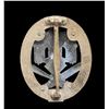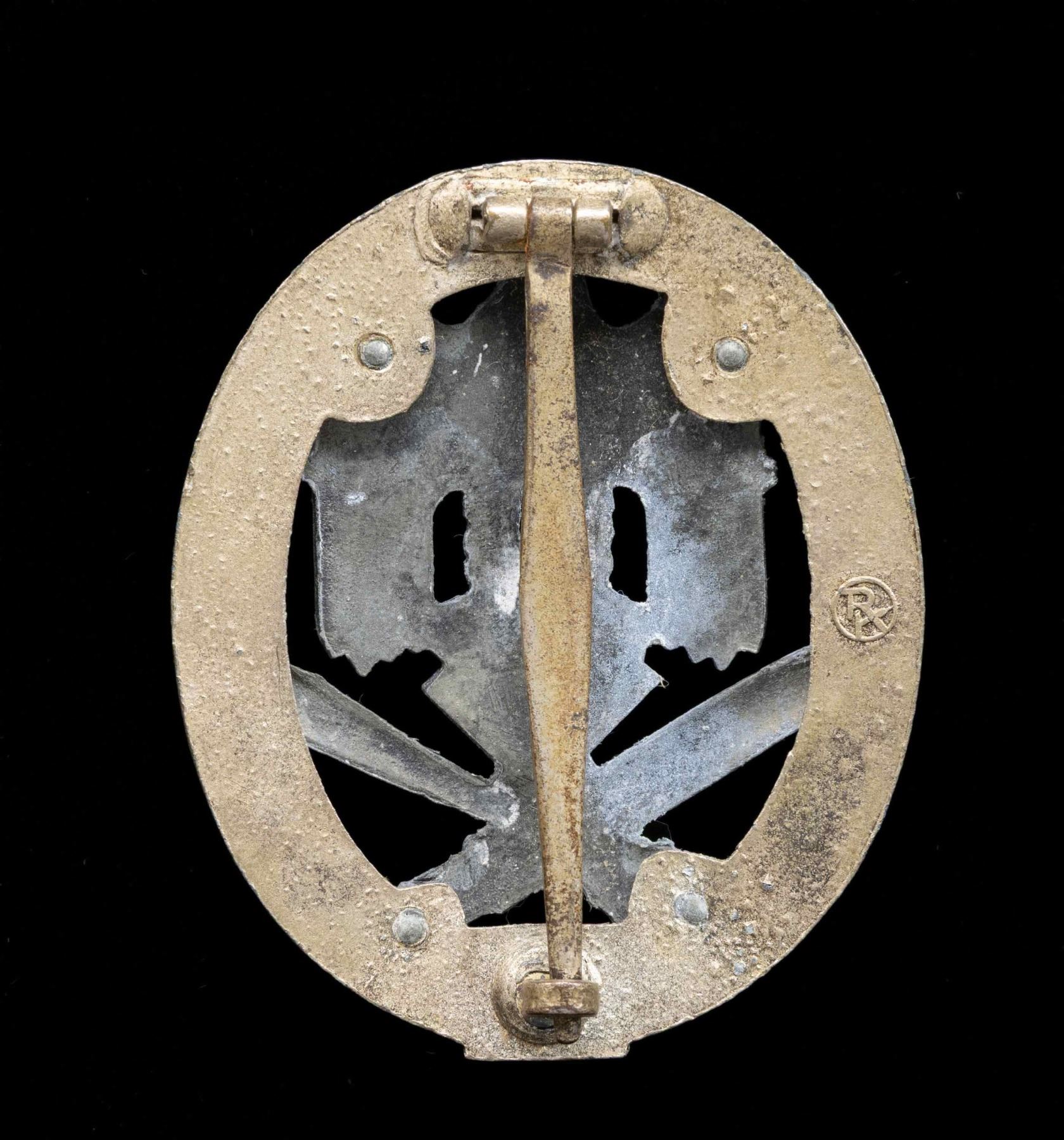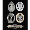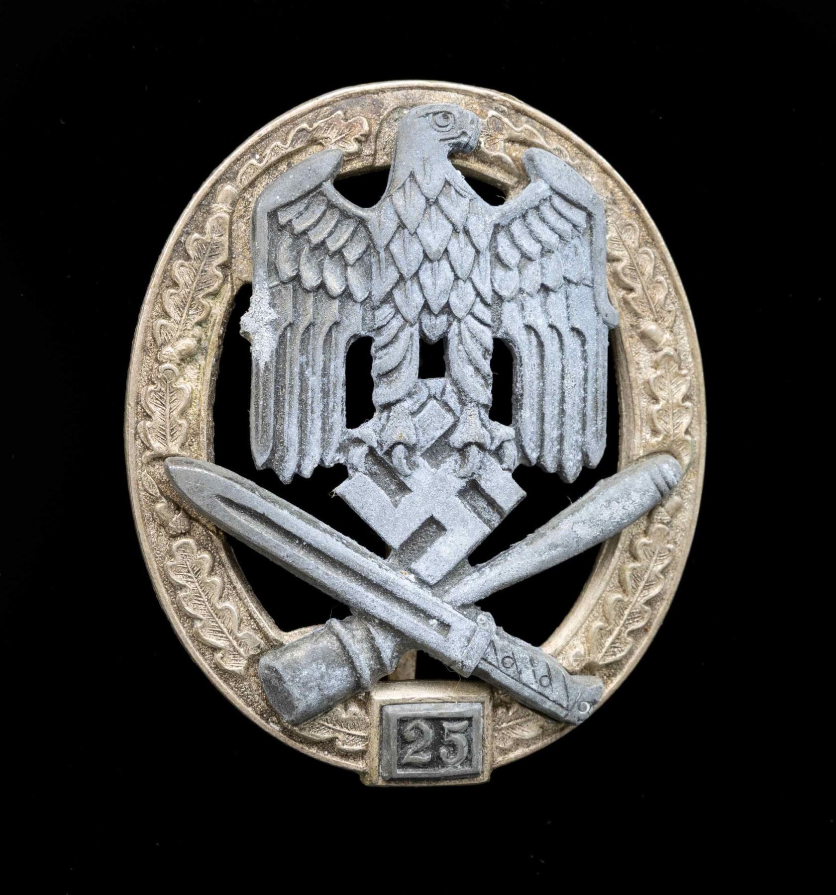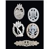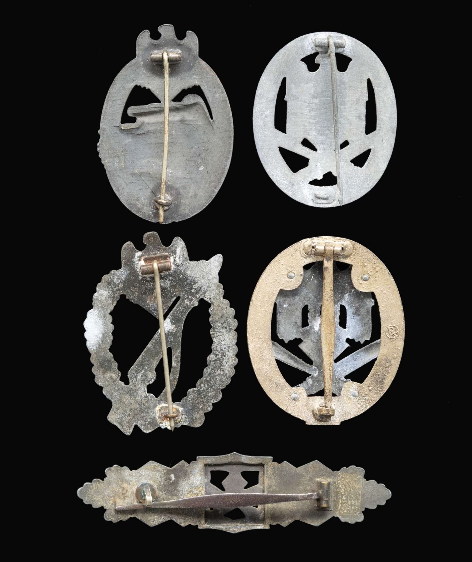 This lot of 5 WWII German Army Badges includes 1) General Assault Badge for 25 assaults. The badge has a gray zinc eagle, bayonet & grenade, and "25" plaque. The wreath is plated zinc. The reverse shows 4 rivet construction with a wide pin, and the wreath is marked "RK" in a circle. 2) General Assault Badge in cast zinc. The reverse is unmarked and has a narrow pin. 3) Tank Assault Badge in stamped zinc. The reverse is unmarked and has a narrow pin. 4) Infantry Assault Badge in cast zinc. The reverse is marked " S.H. u.Co. 41 " with a narrow pin. 5) Close Combat Clasp in bronzed tombak. The reverse is unmarked with a wide iron pin. CONDITION: most items show wear with some degree of oxidation. Please see photos for condition details. (02-24878-14/BF). $900-1,400.