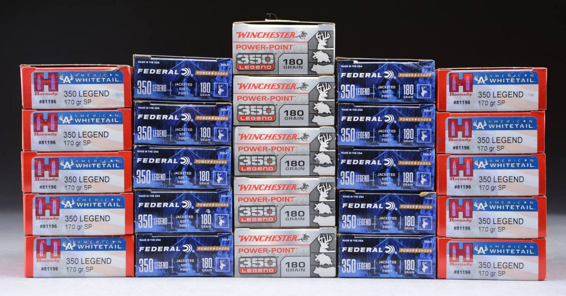 200 RDS. (10 BOXES) FEDERAL 180 GR. JACKETED SOFT POINT. 100 RDS. (5 BOXES) WIN. 180 GR. POWER-POINT. 200 RDS. (10 BOXES) HORNADY AMERICAN WHITETAIL 170 GR. SP. CONDITION: boxes near excellent & ammo appears serviceable. PROVENANCE: The Collection of Gun Sport Ltd owned by Jon R. Thomas. (02-20279/MD). $350-600.