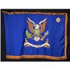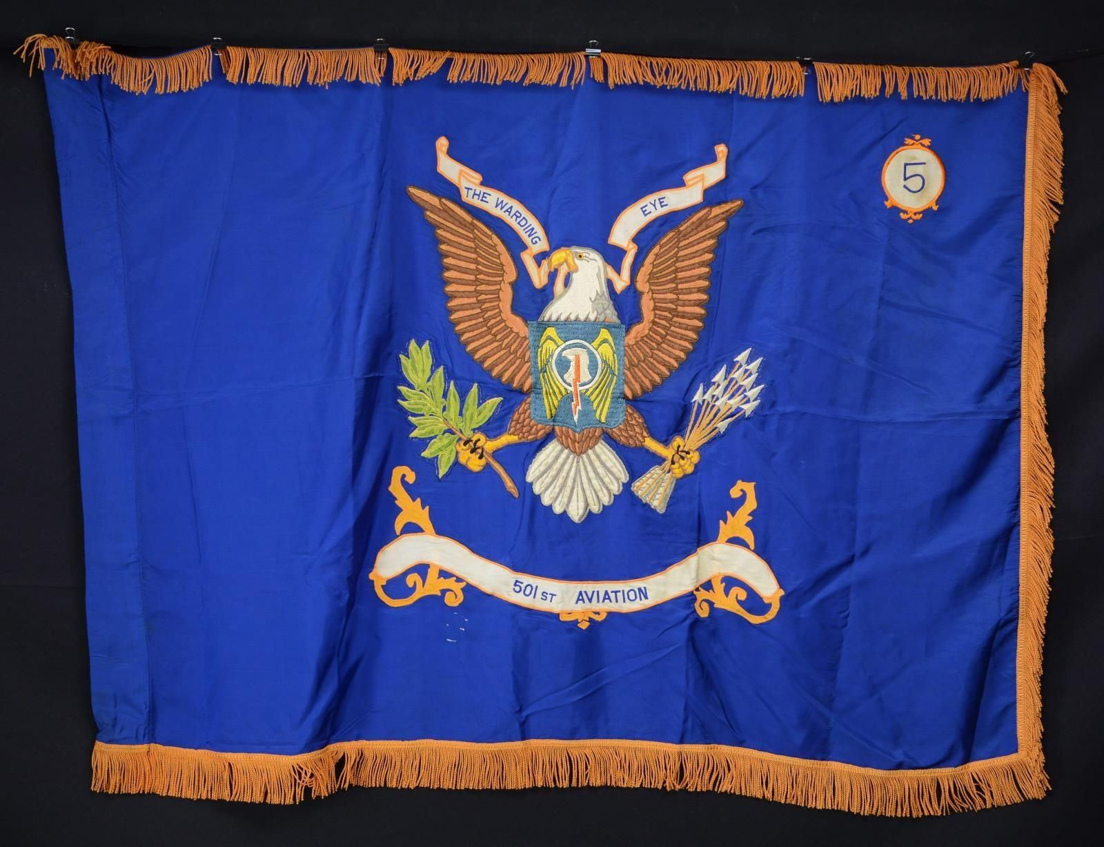 3' x 4' regulation double applique embroidered eagle and crest on Army sky blue field, gold fringe. Motto: “THE WARDING EYE”. Inspection label is missing, flag appears to date circa 1980s as 5th battalion was gone by 1988. This unit began as the 501st Aviation Battalion of the 1st Armored Division when it was activated on August 21, 1978 while the division was posted in Germany. In October 1988 the command was removed from the 1st Armored and renamed as the 501st Aviation Regiment. The regimental headquarters were them moved to South Korea for a time. The regiment was reunited with the 1st Armored Division and have participated in numerous overseas operations from the Balkans to Iraq and Afghanistan along with humanitarian operations in the United States. The unit is currently posted to Fort Bliss in Texas along with the rest of the division. It currently is made up of three battalions and flying Apache attack helicopters, Blackhawk helicopters and Chinook transport helicopters. The regiment contains aviation support units, MEDEVAC and other related to aviation operations. The current Table of Organization shows only three subordinate battalions. The old 4th battalion became the 1st Battalion after that battalion was redesignated as the 3rd Battalion, 6th Cavalry Regiment in 2015. As they are not listed at all currently, the 5th Battalion, which is represented by this flag, must have been disbanded at some point. Their battalion slogan was changed in 1988 to “Death Waits at A Hover.” Condition: very good overall. (02-19982-34/JS). $200-400.
