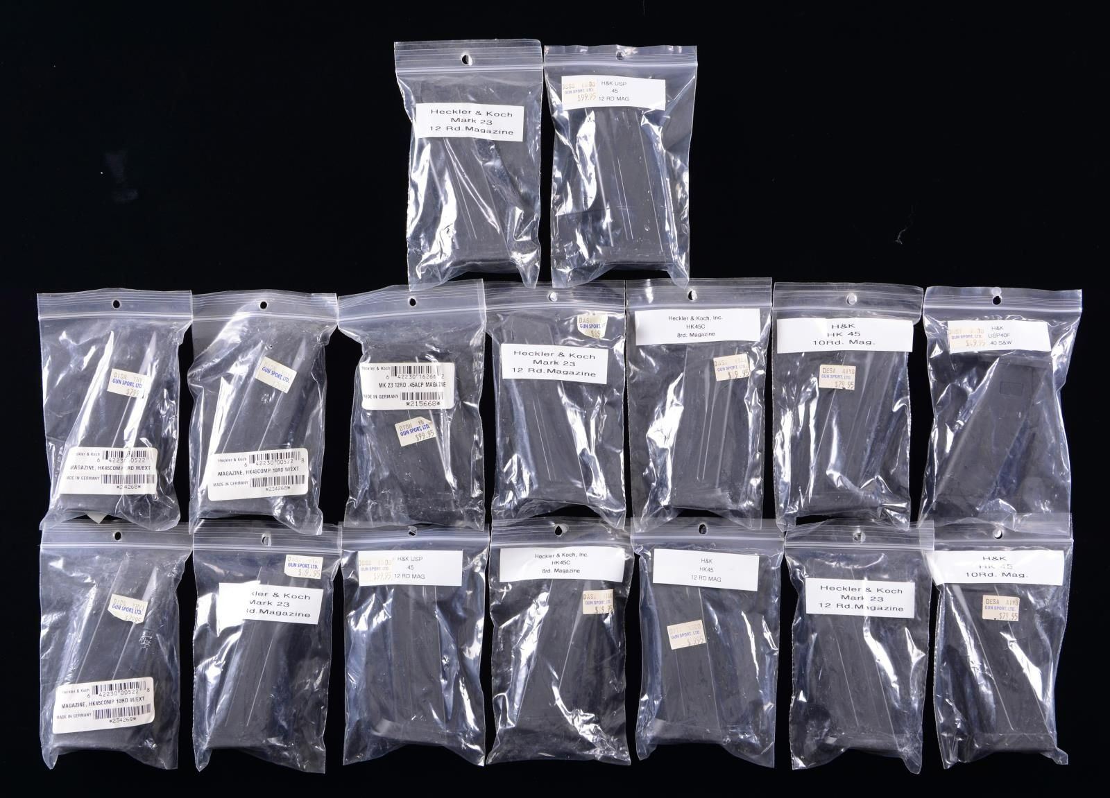 All used, unless otherwise noted. 2 P7PSP 9mm Luger, 8 rd. / 4 P7M8 as 9mm Luger, 8 rd. / 12 P7M13 as 9mm Luger, 13 rd. / 17 MP5 as 9mm Luger, 30 rd. (13 are new). / 1 USP40 as 40 S&W, 10 rd. / 8 MK23 as 45 ACP, 12 rd. / 2 HK45C 45 ACP, 8 rd. / 2 HK45 as 45 ACP, 10 rd. / 3 HK45COMP 45 ACP, 10 rd. PROVENANCE: from the collection of Gun Sport Ltd. owned by Jon R. Thomas. (02-20786/NW). $1,000-1,500.