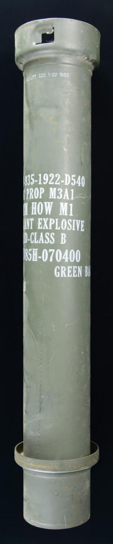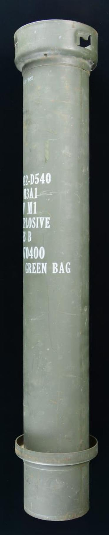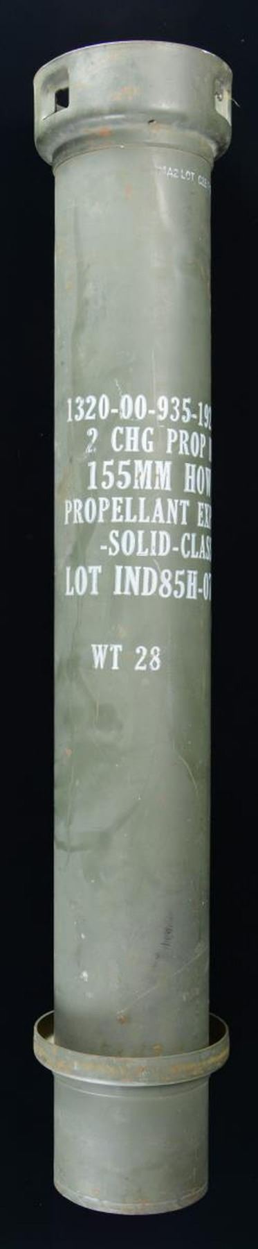 Overall length: 37.5". Marked on exterior "2 CHG PROP M3A1 / 155MM HOW M1 / PROPELLANT EXPLOSIVE / SOLID CLASS B". CONDITION: pied in good condition w/ light wear & retail stickers. (02-19669/MD). $50-100.