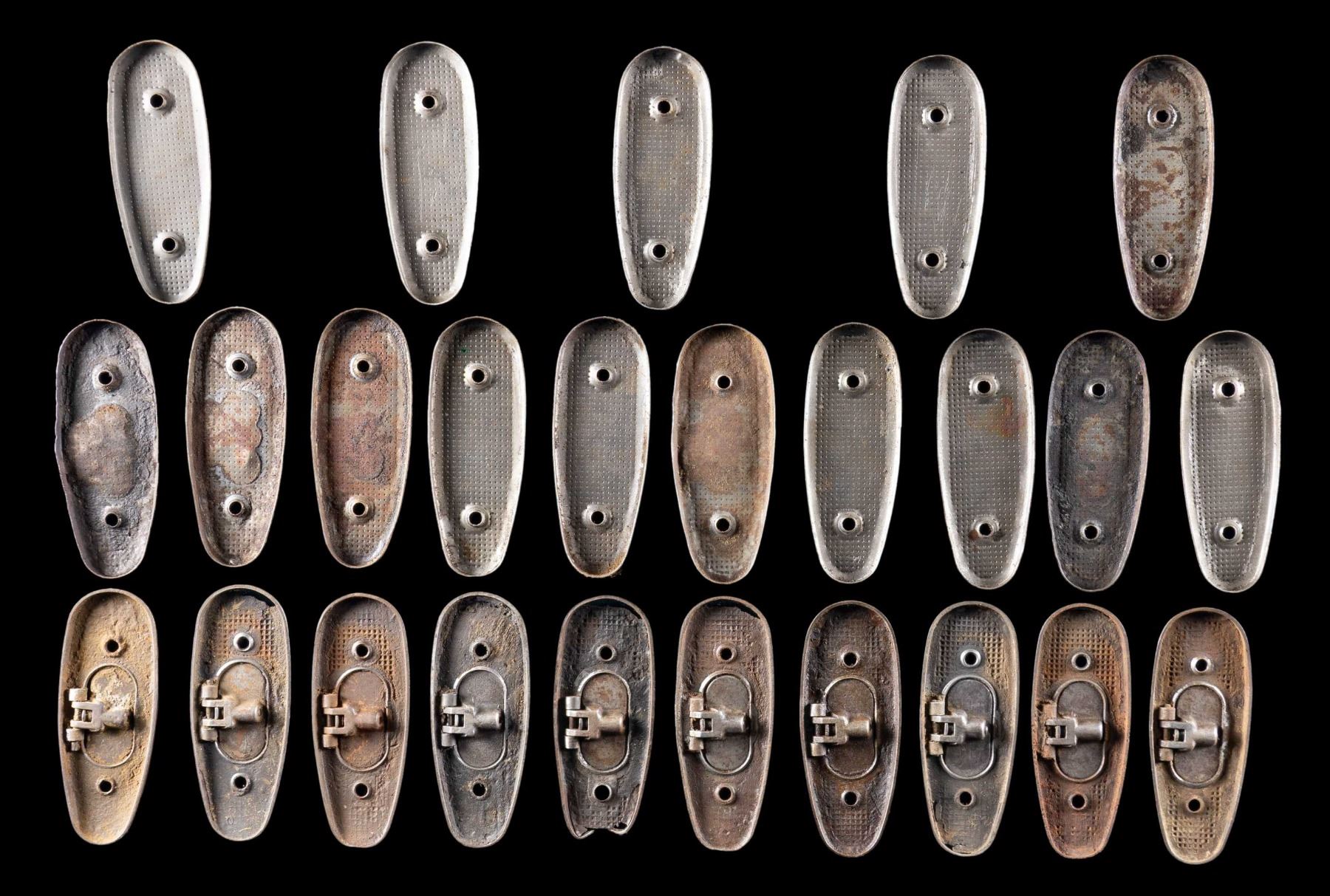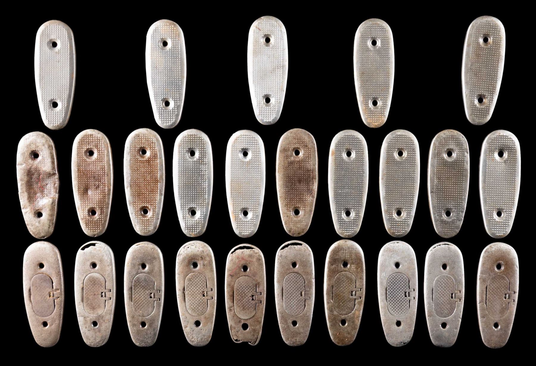 33 are US-made trapdoor type in well-worn, but serviceable condition. 10 trapdoor type buttplates have extensive wear & do not appear serviceable. 15 buttplates are a stamped type, likely of far east origin made w/o trapdoor. Most of these buttplates are well-worn w/ oxidation & dents. (02-24590-23/RW). NON-GUN. $300-500.