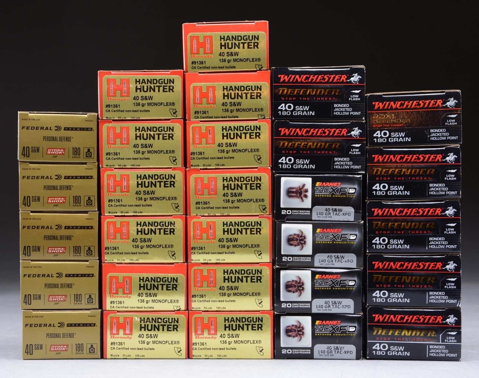 260 RDS. (13 BOXES) HORNADY HUNTER 136 GR. MONOFLEX. 100 RDS. (5 BOXES) FEDERAL PERSONAL DEFENSE 180 GR. HYDRA-SHOK JHP. 140 GR. (7 BOXES) WINCHESTER 180 GR. BONDED JACKETED HOLLOW POINT. 80 RDS. (4 BOXES) BARNES 140 GR. TAC-XPD. CONDITION: boxes very good to near excellent; ammo appears serviceable. PROVENANCE: The Collection of Gun Sport Ltd owned by Jon R. Thomas. (02-20398/MD). $250-400.