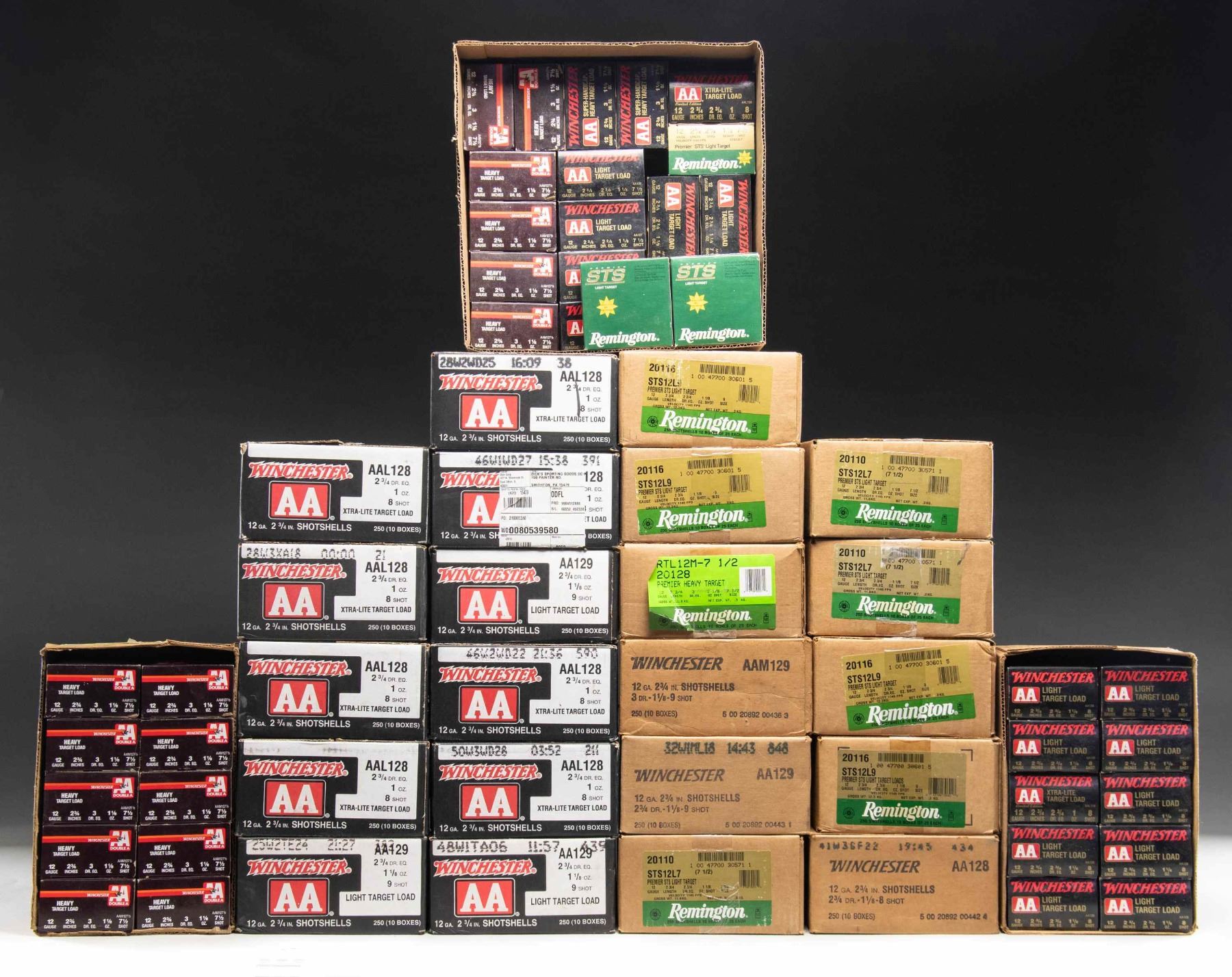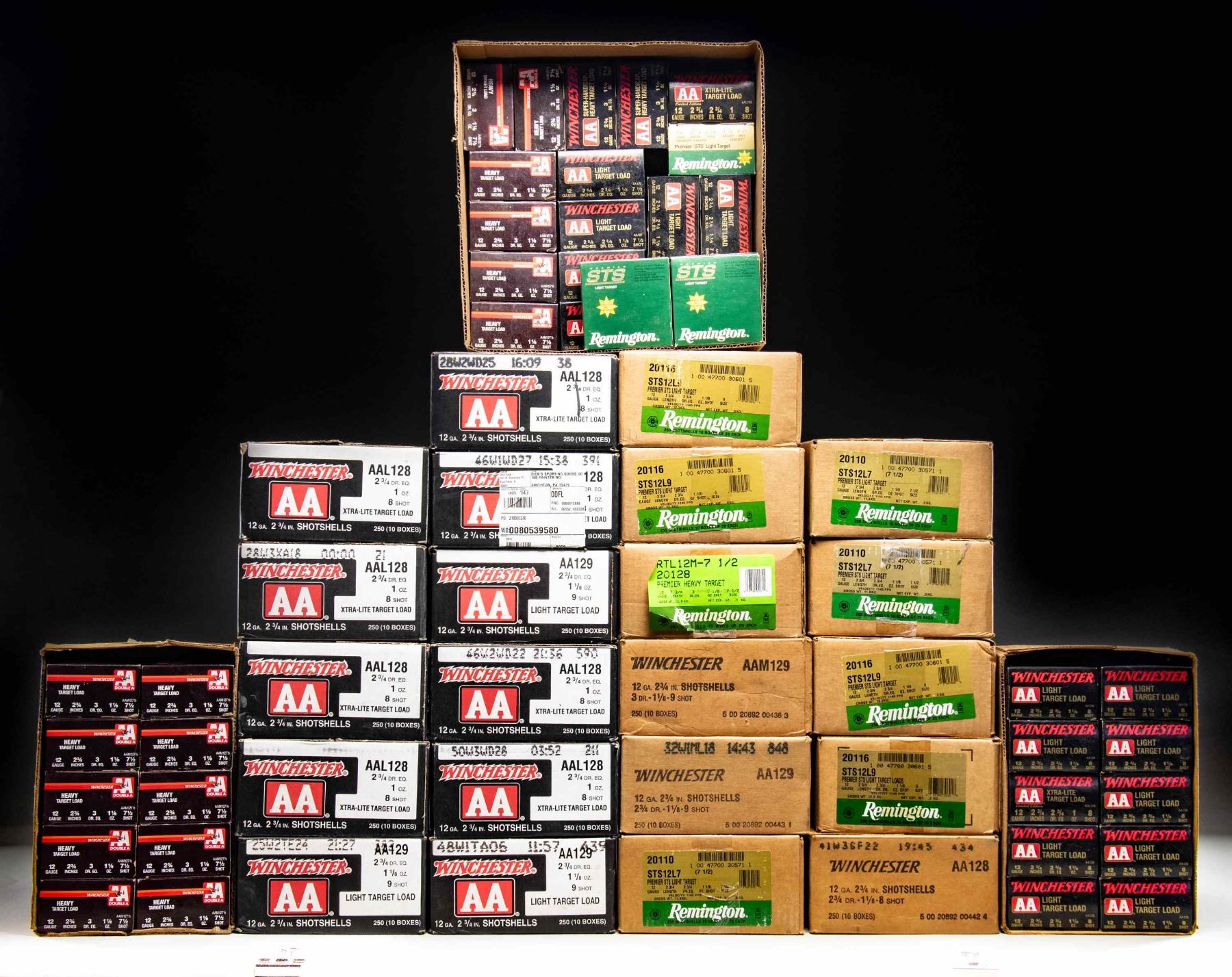 All ammo has 2 3/4" cases and shot sizes from 7 1/2 to 9. WINCHESTER (4,175 rounds): 8 cases of AAL128 with 2 3/4 Dram equivalence plus 1 oz. of #8 shot. / 5 cases of AA129 with 2 3/4 Dram equivalence plus 1 1/8 oz. of #9 shot. / 1 case of AA128 with 2 3/4 Dram equivalence plus 1 1/8 oz. of #8 shot. / 1 case of AAM129 with 3 Dram equivalence plus 1 1/8 oz. of #9 shot. / 1 case plus 6 boxes of AAM129 with 3 Dram equivalence plus 1 1/8 oz. of #7 1/2 shot. / 7 boxes of AA127 with 2 3/4 Dram equivalence plus 1 1/8 oz. of #7 1/2 shot. / 1 box of AA128 with 2 3/4 Dram equivalence plus 1 1/8 oz. of #8 shot. / 2 boxes of AAH127 with 3 Dram equivalence plus 1 1/8 oz. of #7 1/2 shot. / 1 box of AAL128 with 2 3/4 Dram equivalence plus 1 oz. of #8 shot. / REMINGTON (2,000 rounds): 4 cases of Premier STS Light Target having stock numbers of "20446" and "STS12L9" with 2 3/4 Dram equivalence plus 1 1/8 oz. of #9 shot. / 3 cases (plus 2 boxes & 21 rds.) of Premier STS Light Target having stock numbers of "20110" and "STS12L7" with 2 3/4 Dram equivalence plus 1 1/8 oz. of #7 1/2 shot. / 3 case of Premier Heavy Target having stock numbers of "20128" and "RTL12M-7 1/2" with 3 Dram equivalence plus 1 1/8 oz. of #7 1/2 shot. PROVENANCE: Estate of Lloyd Robinson. (02-26049-18/NW). AMMO. $900-1,400.