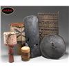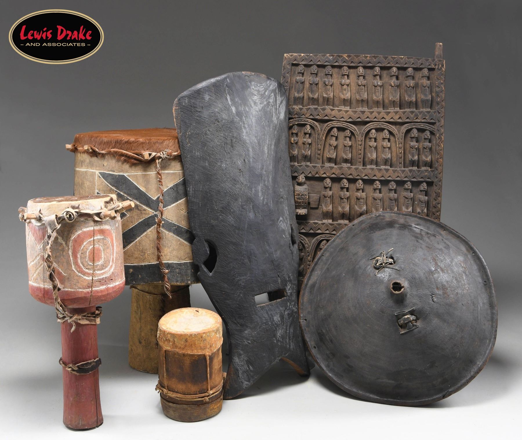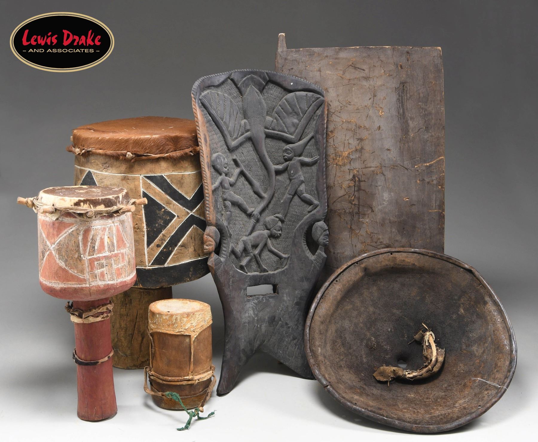This varied lot includes 1 convex hide shield measuring approximately 24" in diameter. / 1 intriguing carved wooden door. The door is carved throughout with various people standing side-by-side in rows. The two left hand ends have integral pintles on the top and bottom. / 1 carved wooden wall hanging with several figures carved into the inside curve. / 1 large hide covered drum measuring 30" high and 18" across. / 1 medium size drum measuring 25" in height. / 1 small drum or container measuring 11 1/2" in height. Most of the drums appear to be from Zimbabwe. CONDITION: all of these items are made by the indigenous people of Africa and were likely used by them prior to being collected by Lewis Drake. All items show average use wear along with some storage wear. No major damage is noted. PROVENANCE: from the renowned collection of quality sporting arms from Lewis Drake together with inventory of Lewis Drake Associates. (02-23563-2/BF). $600-900.