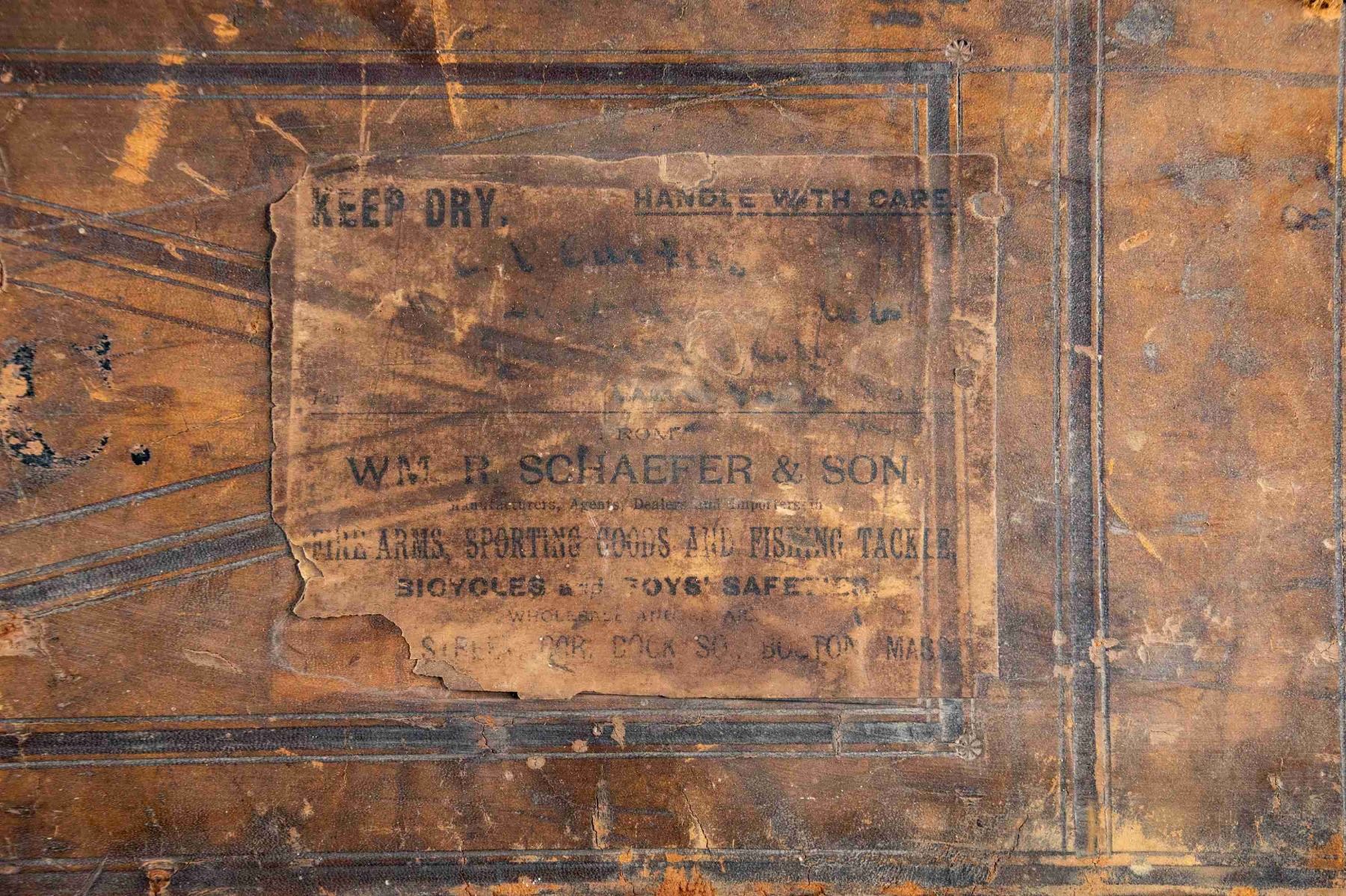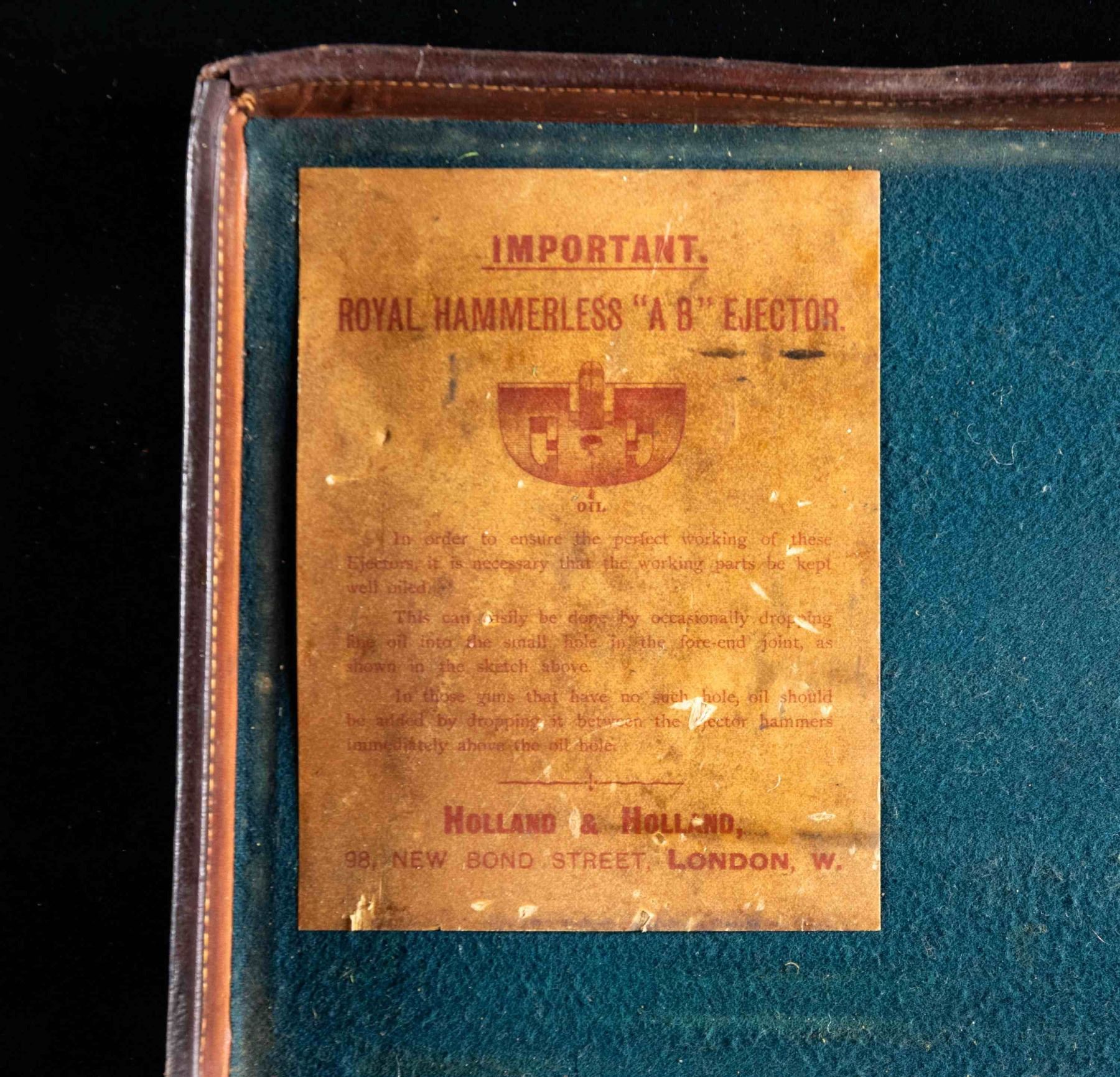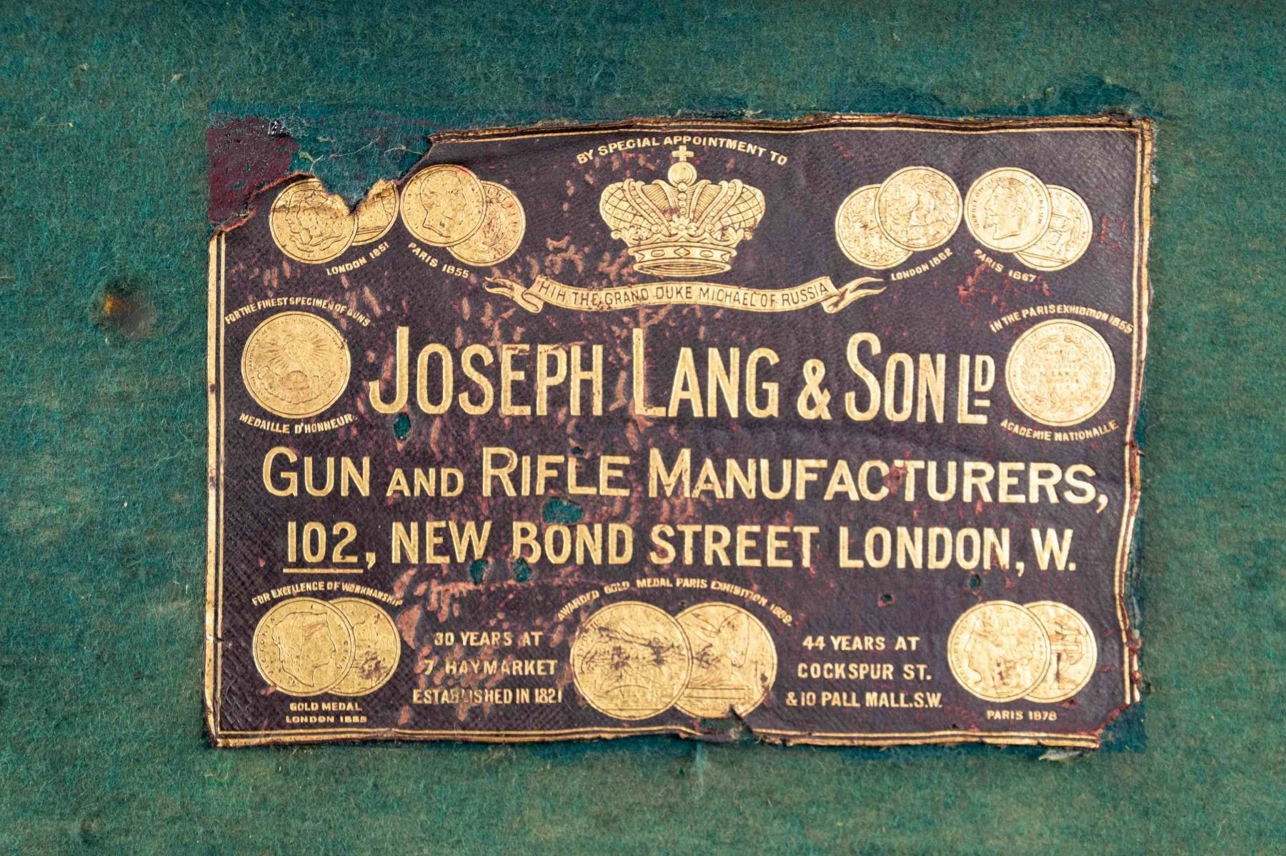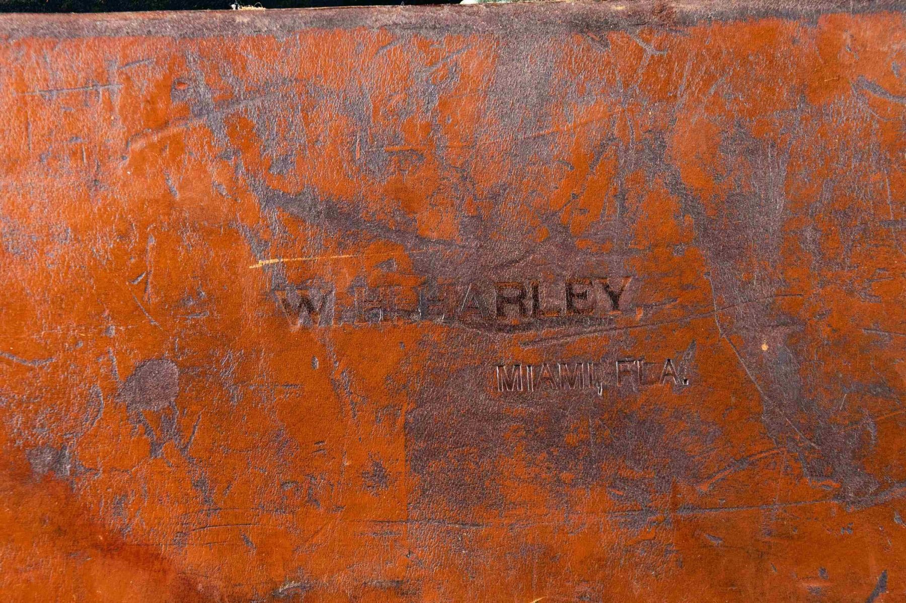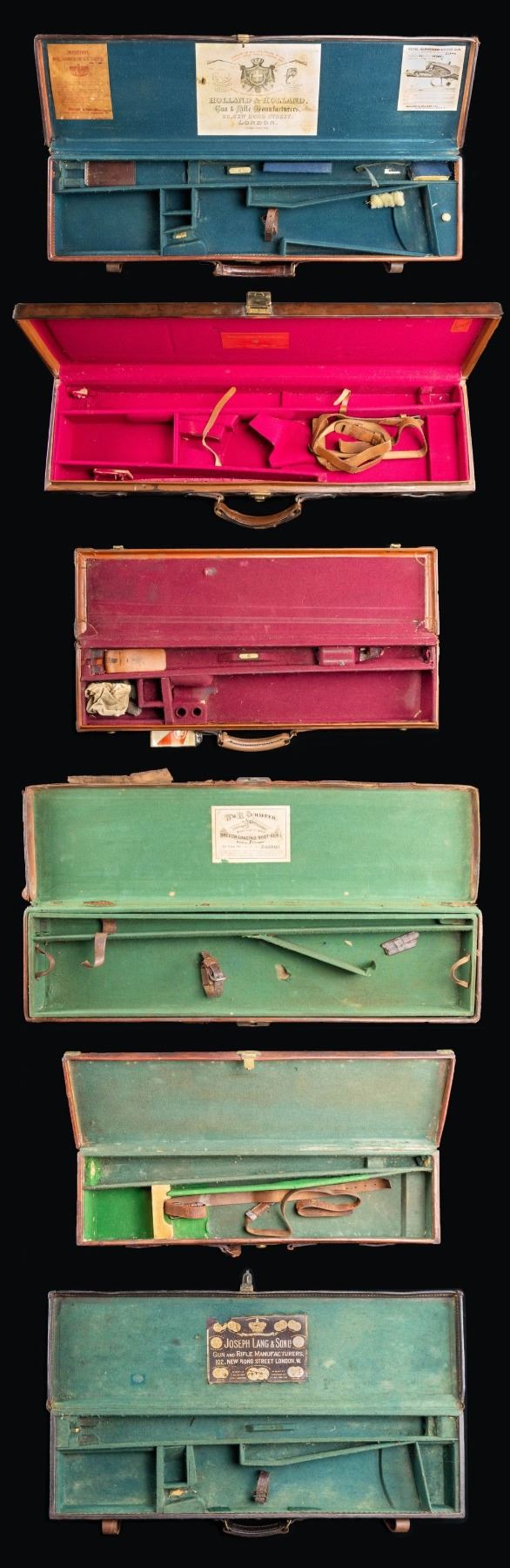1) Leather case with brass corners; lined in green cloth. Top embossed "WH. HARLEY" "MIAMI FLA". SIZE: for 26" barrel gun. CONDITION: fair to good. Leather conserved with many rubs and marks. Straps fair to good; handle partially detached. 2) Leather trimmed canvas case with added exterior leather panels with brass tacks. Central panel on top with added brass British royal crest. Interior is lined in green cloth and has Joseph Lang label in lid. SIZE: Interior is presently configured for 28" barrel gun will except 30". CONDITION: good as conserved exterior attractively enhanced. Straps and handle are good. Interior cloth is stained, marked and rubbed through. Label is fair; chipped around edges and with loss of top grain. 3) Leather "VC" case with stitched leather corners marked Abercrombie & Fitch. Interior is lined in burgundy cloth. SIZE: configured for 26" barrel. Case contains 3 cleaning mops. CONDITION: fair to good. Leather considerably worn on exterior; has been oiled. Interior cloth good; lost of soiling and contact marks. Replaced handle is good. 4) American leather 2 gun case with lift out interior tray is lined in green cloth. A William Schaefer label is in lid. SIZE: configured for 31" barrels. CONDITION: poor to fair. Leather very dry; chipped and with major losses. Handle missing. Lid partially detached. Interior cloth is good. Partitions are loose and there are some rubs through. Label is good with chips around edge; rubbed through at bottom left. Lightly foxed. 5) European style leather case by Universal is lined in reddish cloth and has Abercrombie & Fitch label in lid. Case contains straps. SIZE: configured for 30" barrels. CONDITION: good. Exterior with dark polish. Interior is good. Handle is good. 6) Leather case with 2 brass corners and central medallion is embossed "JHG" on top. Interior is lined in blue-green cloth and has large Holland & Holland label in lid, along with charge card for Royal Hammerless Ejector gun number 29346 in right corner. Upper left has instruction card for AB ejector. SIZE: case is configured for 30" barrels. CONDITION: good to very good. Exterior leather polished. Straps and handles are good. Interior cloth is very good to fine. Partitions are tight. Barrel partitions moved. Labels are good to fine. Lightly foxed and soiled. Large label has a minor rub through. Ejector label considerably foxed almost dark brown. PROVENANCE: From the Private Collection of Berrien Moore III. (02-25883-3/MGM). $500-900.
