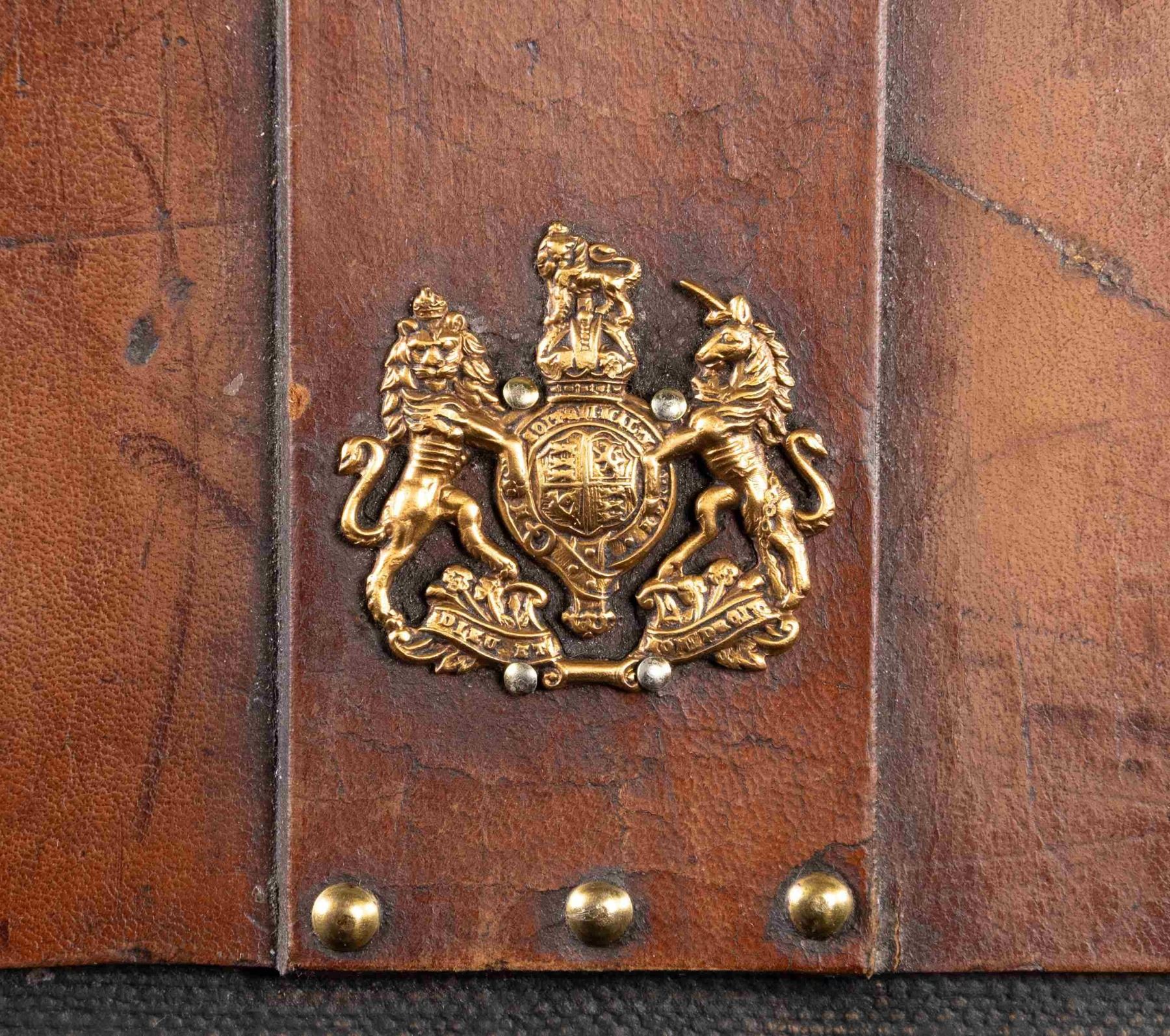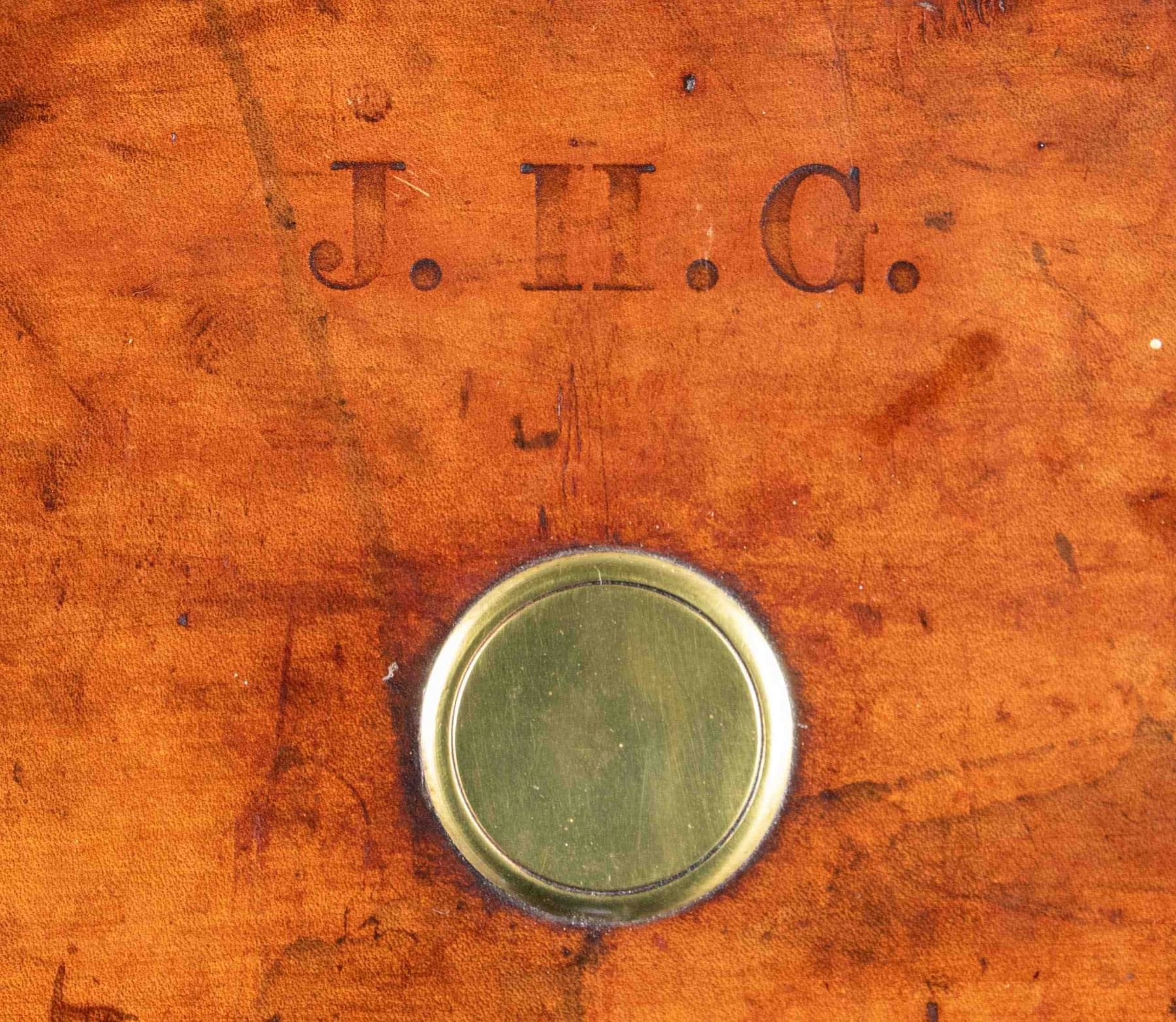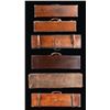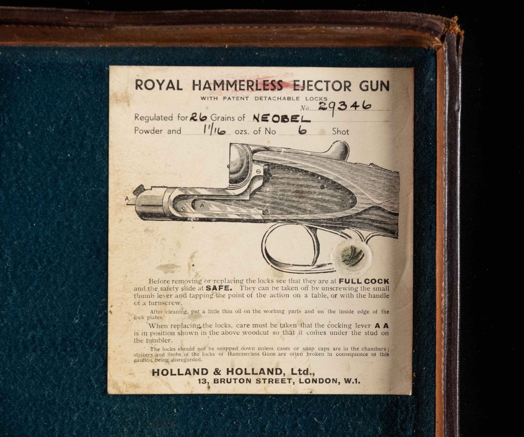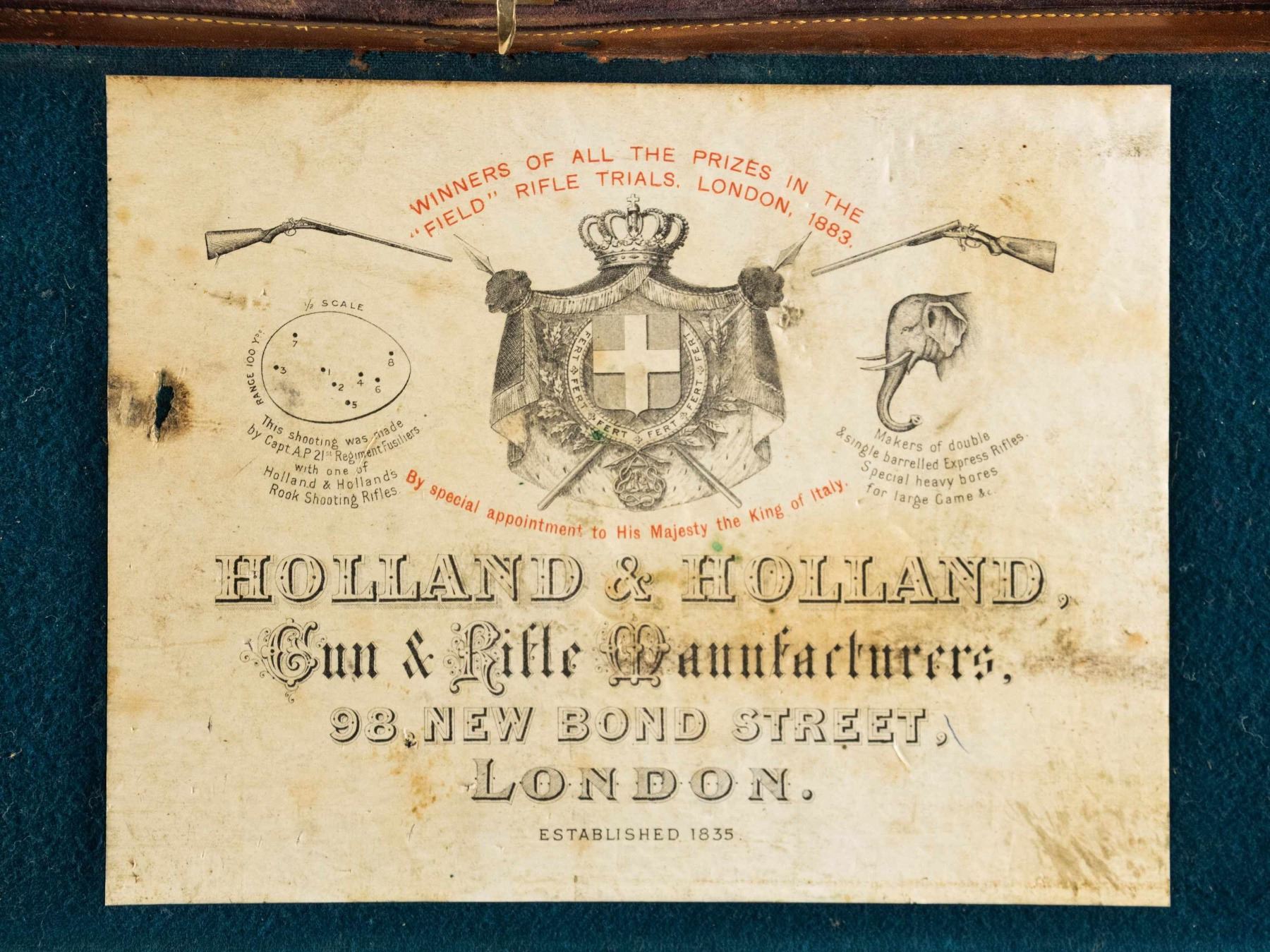 1) Leather case with brass corners; lined in green cloth. Top embossed "WH. HARLEY" "MIAMI FLA". SIZE: for 26" barrel gun. CONDITION: fair to good. Leather conserved with many rubs and marks. Straps fair to good; handle partially detached. 2) Leather trimmed canvas case with added exterior leather panels with brass tacks. Central panel on top with added brass British royal crest. Interior is lined in green cloth and has Joseph Lang label in lid. SIZE: Interior is presently configured for 28" barrel gun will except 30". CONDITION: good as conserved exterior attractively enhanced. Straps and handle are good. Interior cloth is stained, marked and rubbed through. Label is fair; chipped around edges and with loss of top grain. 3) Leather "VC" case with stitched leather corners marked Abercrombie & Fitch. Interior is lined in burgundy cloth. SIZE: configured for 26" barrel. Case contains 3 cleaning mops. CONDITION: fair to good. Leather considerably worn on exterior; has been oiled. Interior cloth good; lost of soiling and contact marks. Replaced handle is good. 4) American leather 2 gun case with lift out interior tray is lined in green cloth. A William Schaefer label is in lid. SIZE: configured for 31" barrels. CONDITION: poor to fair. Leather very dry; chipped and with major losses. Handle missing. Lid partially detached. Interior cloth is good. Partitions are loose and there are some rubs through. Label is good with chips around edge; rubbed through at bottom left. Lightly foxed. 5) European style leather case by Universal is lined in reddish cloth and has Abercrombie & Fitch label in lid. Case contains straps. SIZE: configured for 30" barrels. CONDITION: good. Exterior with dark polish. Interior is good. Handle is good. 6) Leather case with 2 brass corners and central medallion is embossed "JHG" on top. Interior is lined in blue-green cloth and has large Holland & Holland label in lid, along with charge card for Royal Hammerless Ejector gun number 29346 in right corner. Upper left has instruction card for AB ejector. SIZE: case is configured for 30" barrels. CONDITION: good to very good. Exterior leather polished. Straps and handles are good. Interior cloth is very good to fine. Partitions are tight. Barrel partitions moved. Labels are good to fine. Lightly foxed and soiled. Large label has a minor rub through. Ejector label considerably foxed almost dark brown. PROVENANCE: From the Private Collection of Berrien Moore III. (02-25883-3/MGM). $500-900.