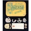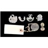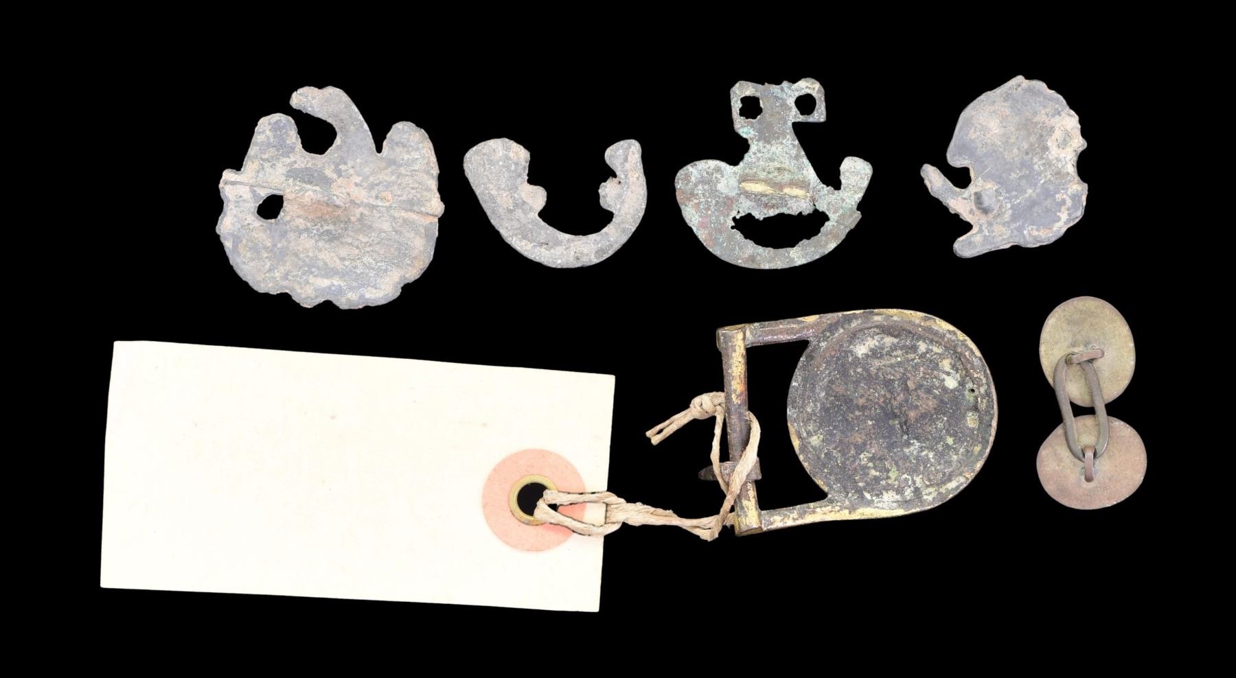 This fascinating group of 6 items includes 1 small US buckle featuring a spread-wing American eagle with 13 stars below and a banner that reads "E PLURIBUS UNUM" above. This buckle is likely one half of a pair used on a dirk belt. An attached tag reads "Buckle and U.S. Ornament from Sackets Harbor N.Y. from C.M. Steurne Mch 21 1901". / 1 Two-piece period cuff link with engraved decoration. / 1 Large cast pewter cockade eagle featuring an eagle looking to its right, perched on clouds. / 1 Small cast pewter cockade eagle featuring an eagle looking left, perched on clouds. / 1 Brass hunting horn insignia with looped cord at the top. / 1 Trumpet section from a brass hunting horn insignia. CONDITION: all items are excavated and have appropriate patinas. The buckle retains a large percentage of its original gilded finish. PROVENANCE: Luis F. Emilio estate collection. (02-23227-14/BF). $800-1,200.