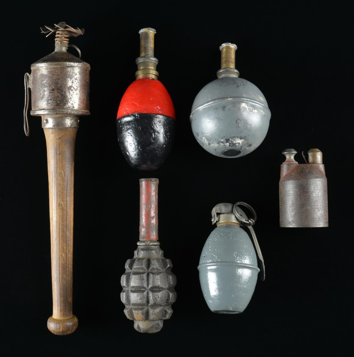 6) F1. Cast iron "pineapple" style grenade w/ 1915 style plug fuse. CONDITION: ranging from fair to good overall w/ handling wear, flaking finish & oxidation. (02-16270-4/MD). $500-750.