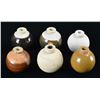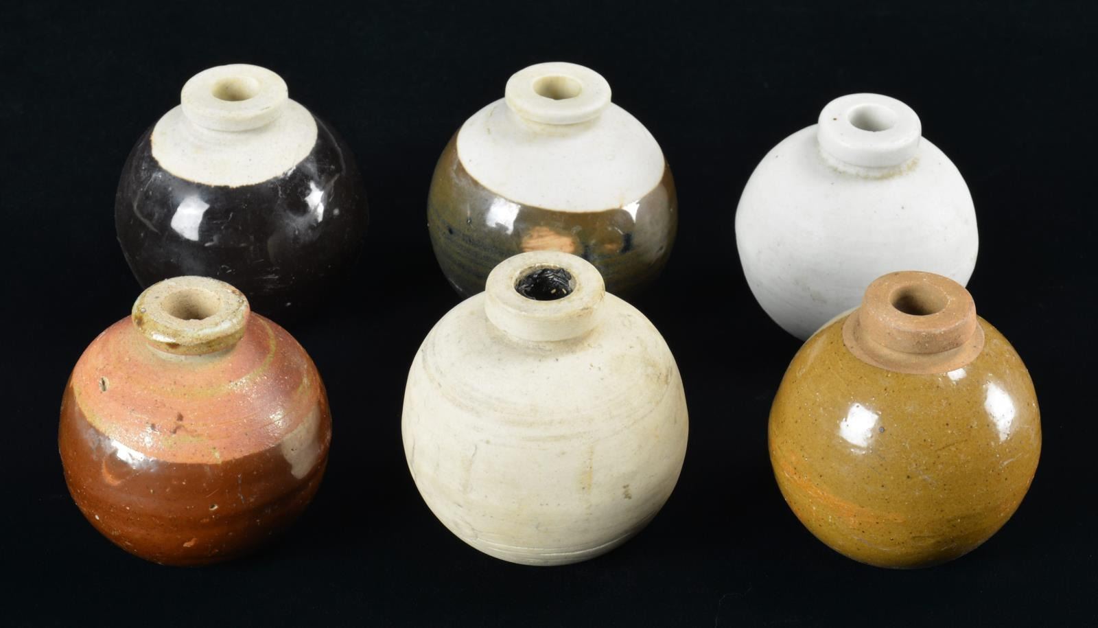 These grenades were part of the last ditch effort by Japan during World War II. When metal resources became scarce, ceramic or similar materials were used for grenade bodies. These 6 grenades are of various colors & styles of necks w/ 4 having glaze finish on exterior; no fuzes or caps. CODITION: all grenades appear intact w/ a few minor scuffs & spots of missing glaze. (02-16279-2/MD). $200-300.