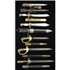 This group of reproduction daggers includes 1 RAD leaders’ dagger with a zinc hilt and a plated brass sheath. Blade is not maker marked but does have the motto. / 1 TENO leaders’ dagger with a plated hilt and plated mounts on the painted wooden sheath. Blade is stamped “1225” as is the throat of the sheath. Blade is stamped with a TENO eagle and the words “GES. GESCH.” & “ORIGINAL (squirrel) EICKHORN SOLINGEN”. Sheath has an original style hanger attached. / 1 Dress bayonet with staghorn grips and a bird effigy pommel. Blade is unmarked. Black painted sheath with black leather frog. Bayonet has a sword knot attached. This bayonet shows significant age and could actually be a period piece. / 1 Hunting Association dagger. Blade is etched with running deer and a hunter shooting a stag. No manufacturers mark. Downturned shell guard with deer hoof quillons. Stag grip with Hunting Association insignia applied. Acorn finial at the pommel. Silver plated mounts on a leather covered sheath. / 1 Forestry dagger. Dagger has a fully etched blade featuring deep hunting & boar hunting scenes. Blade is marked “ORIGINAL (squirrel) EICKHORN SOLINGEN”. Gilded hilt with 2-piece staghorn grip with 3 acorns on each grip. Gilded mounts on the sheath with leather covered body. / 1 Forestry dagger. Dagger has a fully etched blade featuring deep hunting & boar hunting scenes. Blade is unmarked. Gilded hilt with German eagle on the ferrule with 2-piece staghorn grips with 3 acorns on each grip. Gilded mounts on the sheath with leather covered body. CONDITION: TENO, RAD & bayonet show moderate wear. Forestry & hunting daggers show very light wear. (02-16748-4/BF). $700-1,000.