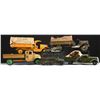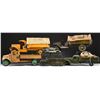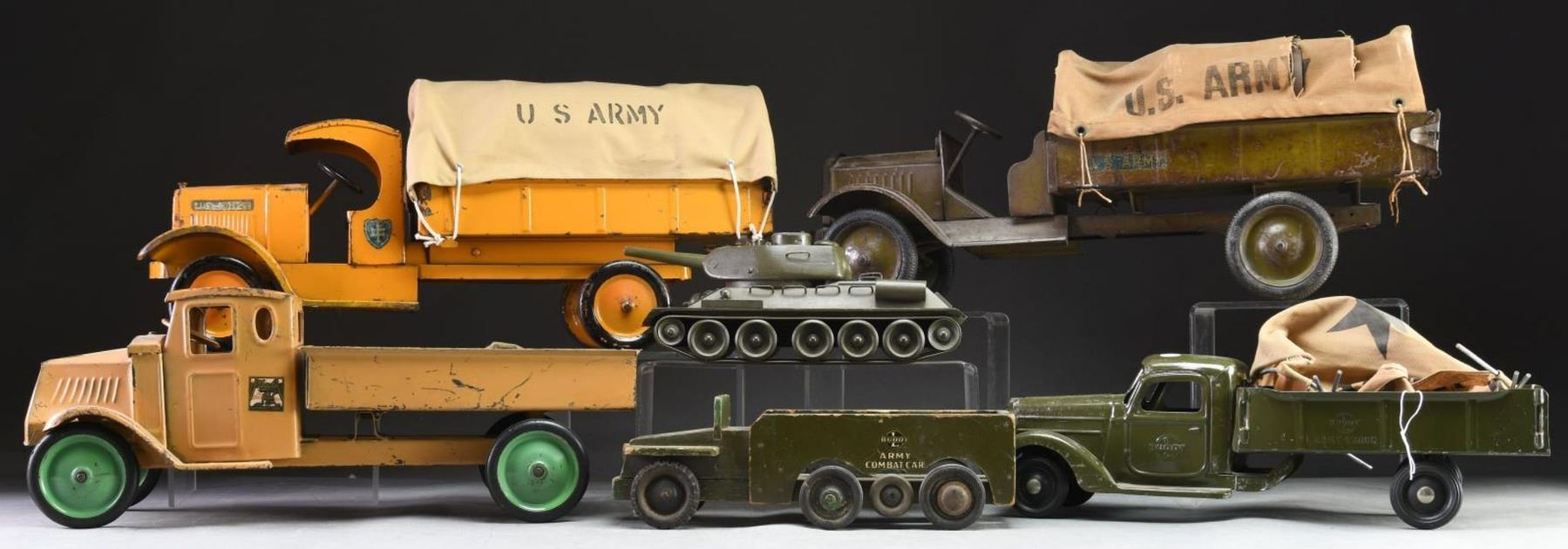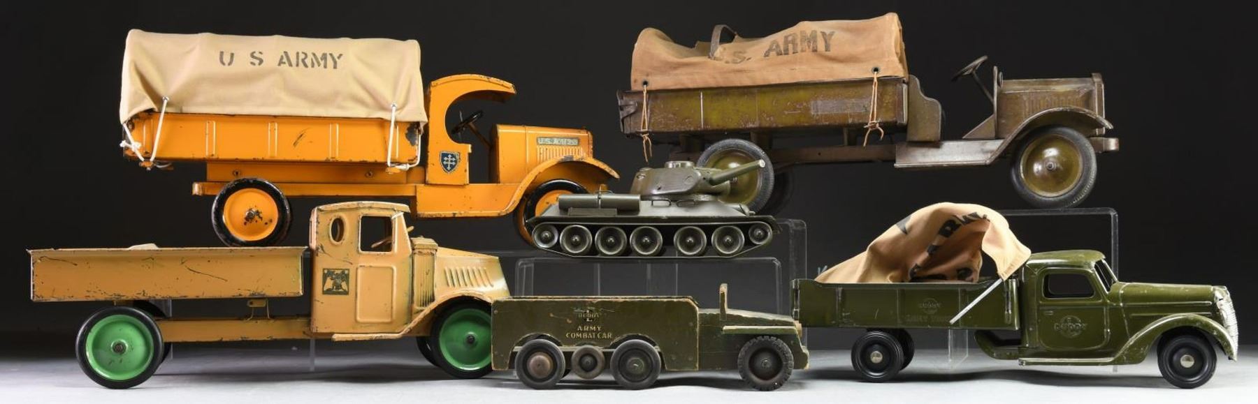 1) WOOD. A 14” wooden troop transport car made by “BUDDY L”. The front & rear of the vehicle are made of wood and the sides are made of Masonite. The wheels are black painted wood. The vehicle is OD green overall with decals on each side that read “BUDDY L ARMY COMBAT CAR”. CONDITION: light to moderate wear. 2) METAL. A 20” sheet metal truck made by “BUDDY L”. The entire truck is made of metal with the wheels made of hard rubber. The vehicle is OD green and is embossed on each door “BUDDY L”. The bed of the truck is embossed “BUDDY L ARMY TRUCK”. The truck has a tan cloth colored canopy that reads “U.S. ARMY” on each side with a star on the top. CONDITION: light to moderate wear. 3) WOOD. A 13 1/2" wooden tank. The entire tank is made of wood with a removeable turret. The treads are made of rubber. The entire vehicle is dark green. The base is marked “HOLZ-MECHANIK-GMBH 6910-43019 T34/85 (waffenamt) 12-123-1825.”. CONDITION: light wear overall. 4) METAL. A 26 1/2" metal truck. The entire truck is made of yellow painted metal with a canvas cover to the bed that is stenciled “U.S. ARMY”. The front of the radiator reads “Sonny” above “The Dayton Toy & Specialty Co Dayton, Ohio”. The sides of the engine cover have a decal that reads “U.S.A. 1120”. There is a shield on each side of the cab that has a Greek Orthodox cross on it. The bed has a metal framework that supports the canvas cover. CONDITION: toy shows moderate wear with scrapes to the paint and some loss to decals. The canvas cover appears to be a modern replacement. 5) METAL. A 25 1/2" metal truck with a canvas cover over the bed. The truck has a green painted finish that is quite worn. There is a decal inside the cab of the truck that reads “KEYSTONE PACKARD MODEL GUARANTEED GENUINE KEYSTONE TOY BUILT BY KEYSTONE MFG CO BOSTON, MASS USA”. The bed of the truck has blue decals that read “U.S. ARMY” on both sides. The canvas awning over the bed is original. The tires read “HOOD BALLOON TIRE MADE FOR KEYSTONE TRUCKS”. CONDITION: truck shows oxidized surfaces. The canvas cover has 2 tears. The right side decal on the bed is mostly gone. 6) METAL. A 22 1/2" metal truck with a tan painted finish. The entire truck is metal, including the tires. There is a decal on each side of the cab that reads “MACK JR. PERFORMANCE COUNTS”. The bed has a decal in the rear that reads “STEEL CRAFT MURRAY, OHIO MFG CO”. The tires are green with black outer edges. There is a cloth canopy that covers the bed and is stenciled “US ARMY”. CONDITION: truck has scratches to the painted finish but is substantially solid. The canopy is complete. PROVENANCE: From the Lifelong Collection of Glen E. Mattox. (02-18692-1/BF). $200-400.