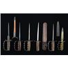 1) 1 M1917-18 US trench knife w/ triangular blade marked, “U.S. L.F. & C. 1917”. CONDITION: blade has a mottled gray patina. Grip has a noticeable drying crack. 2) 1 M1917-18 US trench knife w/ triangular blade marked, “U.S. L.F. & C. 1917”. CONDITION: blade is a bit shortened. Grip has a few short drying cracks. 3) 1 M1917-18 US trench knife w/ triangular blade marked, “U.S. L.F. & C. 1917”. CONDITION: blade has remains of original bluing. Scabbard may have replaced leather. 4) 1 M1917-18 US trench knife w/ triangular blade marked, “U.S. L.F. & C. 1917”. CONDITION: blade has remains of original bluing. There is a drying crack in the grip. Only the top mount of the scabbard remains. 5) 1 US MK 1 trench knife. Knife appears to be original, however the blade has been chrome plated & the hilt has been gold plated. Scabbard remains unaltered. CONDITION: chrome plating on blade is about 80%. Gold plating on hilt is about 70%. Scabbard is undamaged. 6) 1 M1917-18 US trench knife with triangular blade marked "U.S. L.F. & C. 1917" . No scabbard. CONDITION: knuckle bow has been removed. Remainder of knife shows light to moderate wear.(02-14397-1(6)/BF). $1,000-1,300.