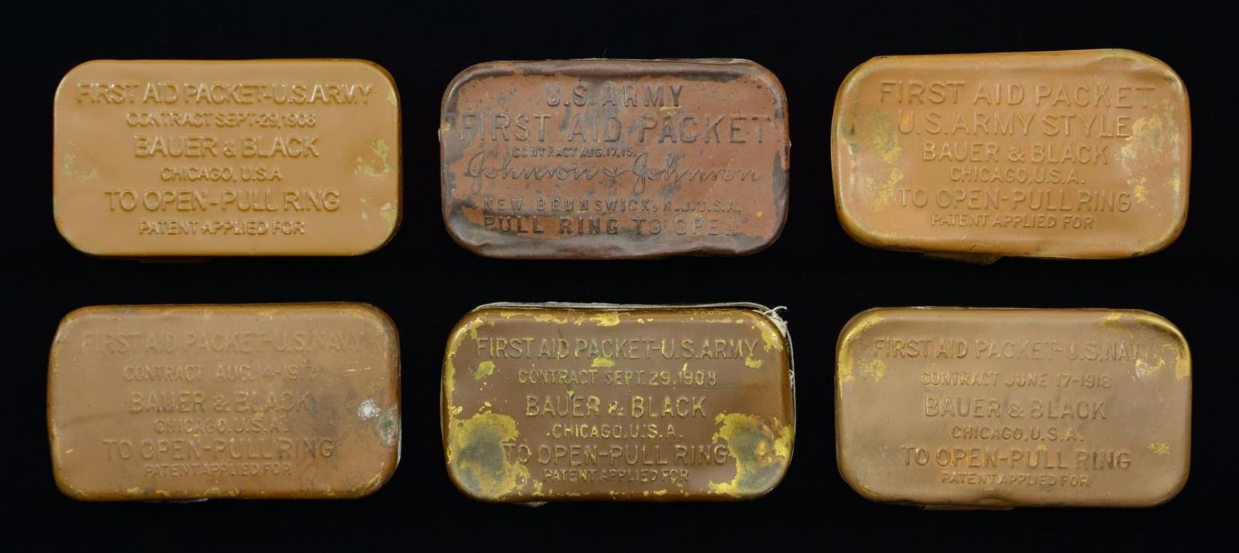 US ARMY 1) SEALED BAUER & BLACK. Contract dated Sept. 29, 1908. 2) SEALED BAUER & BLACK "US ARMY STYLE". 3) EMPTY JOHNSON & JOHNSON. Contract Aug. 17, 15. 4) OPENED BAUER & BLACK. Contract dated Sept. 29, 1908. Appears to contain only gauze. US NAVY 5) SEALED BAUER & BLACK. Contract dated June 17, 1918. 6) SEALED BAUER & BLACK. Contract dated Aug, 17, 1917. CONDITION: all sealed kits have good finish with dents & flaking finish. Opened kits show flaking finish, dents & oxidation. Backs of all kits have show stickers. PROVENANCE: The Collection of Edward Scott Meadows. (02-22126/MD). $250-400.