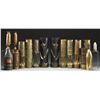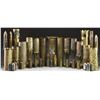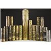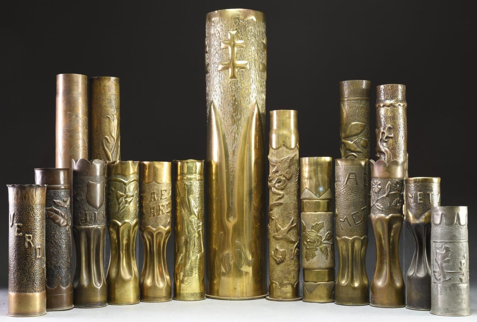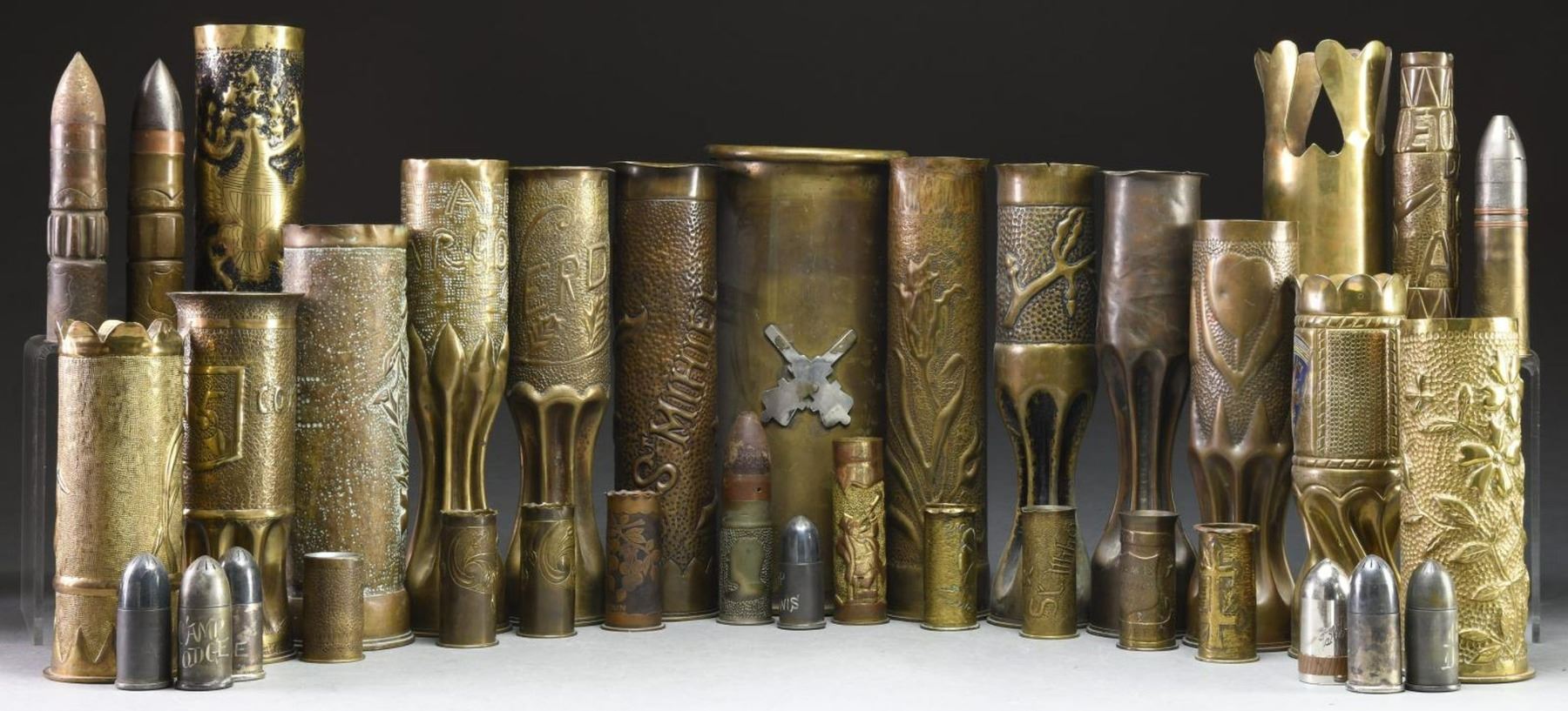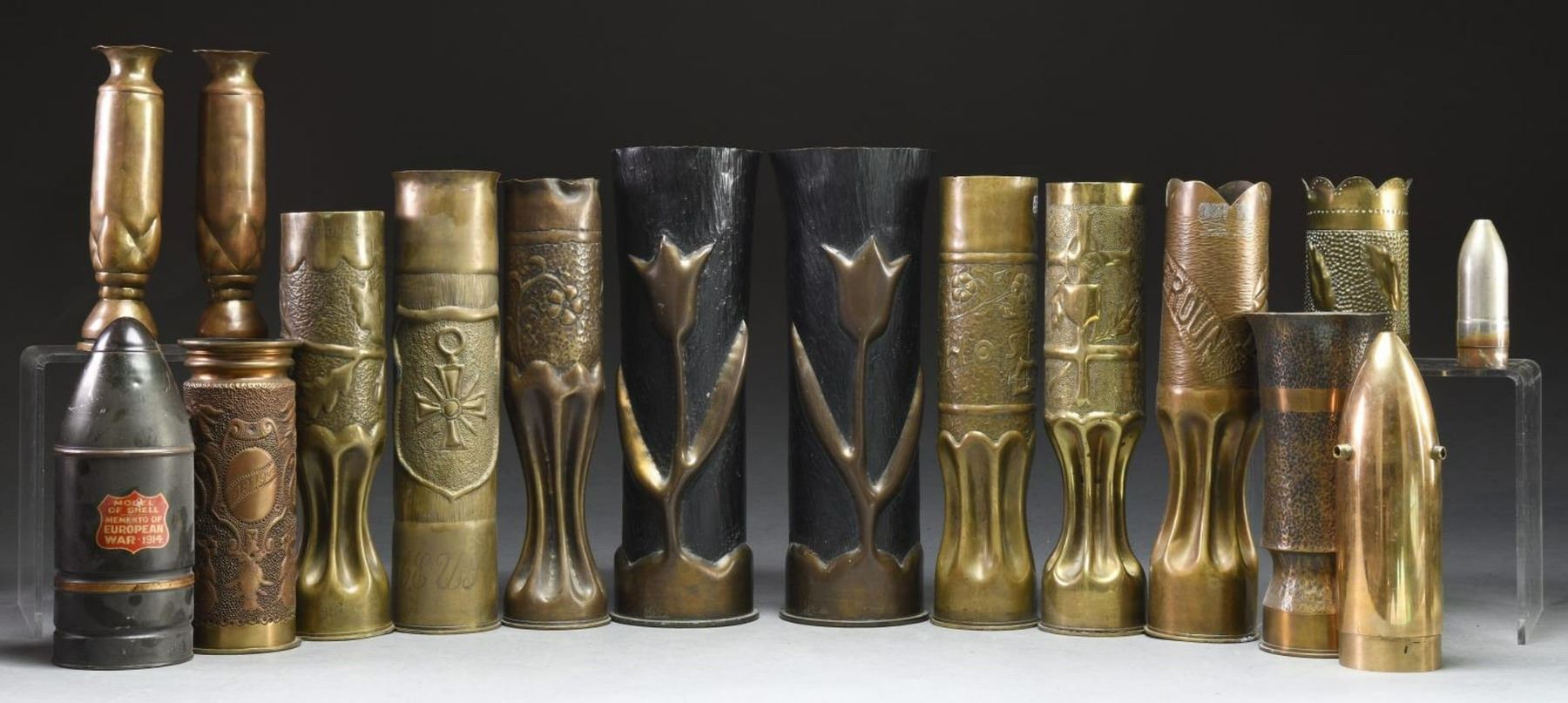 This large lot of varied trench art mostly consists of repoussé work on brass artillery shells. The largest shell in this lot is 28 1/2" tall, and there is one that is 18 1/2" tall. The remaining 67 pieces range in height from 4” to 14 1/2". Many techniques are used to decorate these shells, but repoussé work was obviously the most popular. Included are two projectile heads and one model projectile head produced in 1914. CONDITION: these pieces generally have a rich mustard patina and show light overall wear after their transformation from instruments of war to objects of art. PROVENANCE: From the Lifelong Collection of Glen E. Mattox. (02-18703-1/BF). $800-1,400.