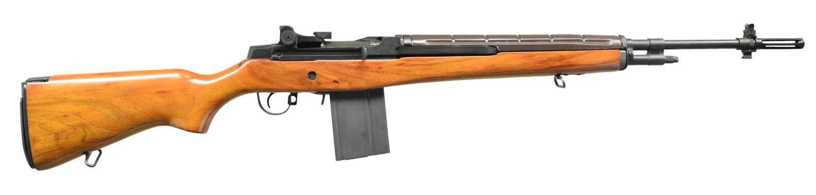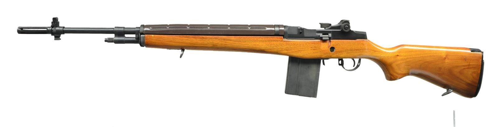 Cal.7.62x51mm. S# 015625. Bbl. 25" over 3" flash hider. Mfg.1980. The vast majority of complaints about the (new) AR15 fielded during the Vietnam War was based on the ballistic superiority & effectiveness of the then current M14. The M1A is the civilian mfg. semi-auto evolution of that rock solid battle rifle. Barrel terminated w/ standard 3" flash hider/front sight/bayonet lug. Walnut stock & brown plastic handguard. Protected blade front & windage/elevation adj. peep, marked "520". Correct trapdoor buttstock w/ folding shoulder support/buttplate. Matte black receiver & barrel finish. Sling swivels front & rear. CONDITION: finish coverage is complete & consistent w/ only some light thinning in areas of mechanical intervention. Highly polished Walnut stock has only a few impressions under close inspection. Bore is bright w/ strong rifling. Fire control mechanism appears to function correctly when cycled by hand. (23-523/JZ). MODERN. $900-1,200.
