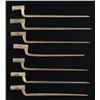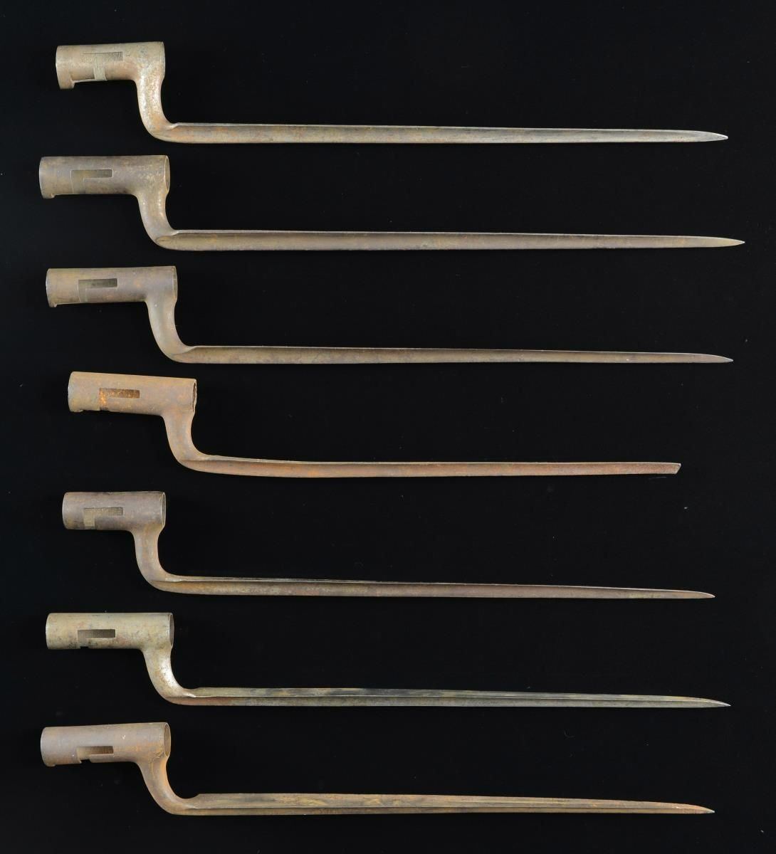 1) Overall: 18 1/2". Blade: 15" marked " JB US / B". Muzzle ring: .87". CONDITION: fair w/ oxidation & marks. 2) STATE OF MARYLAND. Overall: 17 3/4". Blade: 15" marked "M " & "US". Muzzle ring: .87". Unbridged socket. Muzzle ring: .84". CONDITION: fair w/ oxidation & marks. 3) Overall: 18 1/4". Blade: 15" stamped "JN US". Muzzle ring: .87". CONDITION: fair showing patina & oxidation. 4) Overall: 18 1/2". Blade 15 1/4" stamped "B". Muzzle ring: .86". Unbridged socket marked "B". CONDITION: good showing scattered patina & oxidation. 5) Overall: 18". Blade: 15" marked " JB US" & 2 unusual cyphers. Bridged socket marked "I". Muzzle ring: .88". CONDITION: Bayonet has good in the white appearance w/ scattered patina & oxidation. 6) Overall: 19". Blade: 15 1/2" marked " JA US" . Bridged socket. Muzzle ring: .86". CONDITION: bayonet has fair appearance w/ oxidation & patina. 7) Overall: 16 1/2" w/ broken tip. Blade: 13 1/4" marked " C US". Muzzle ring: .86". CONDITION: relic w/ broken tip, deep patina & oxidation. (02-20175/MD). $200-400.