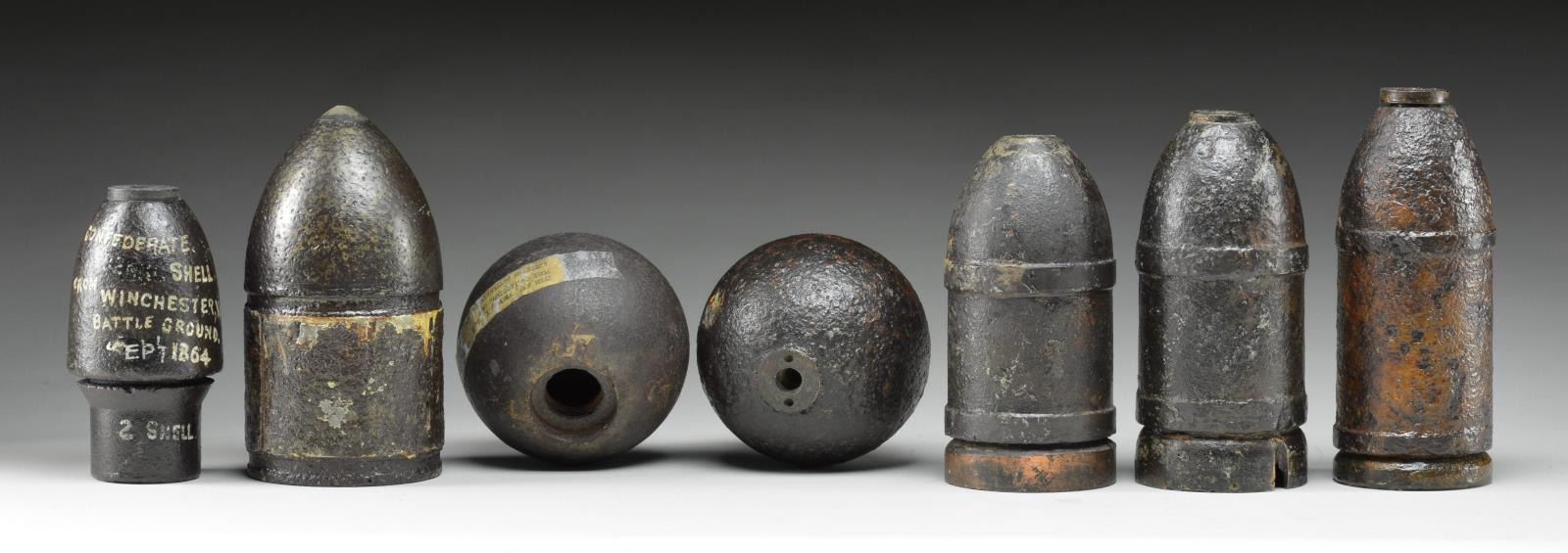 5 RIFLE PROJECTILES: 10 POUND James Bolt style; approx. 7" overall & 3.8" diameter. / 7 POUND Selma style w/out fuse; approx 6.5" overall & 3.18" diameter. / 7 POUND Selma style w/out fuse; approx. 7.25" overall w/ 3" diameter. / 8 POUND Selma style w/out fuse; approx. 7" overall w/ 3.18" diameter. / 4 POUND shell w/ white markings "CONFEDERATE / SCHENKL SHELL / FROM WINCHESTER,VA / BATTLEGROUND / SEPT 1864 /2 SHELL" no fuse; approx. 5.5" overall w/ 3" diameter. /