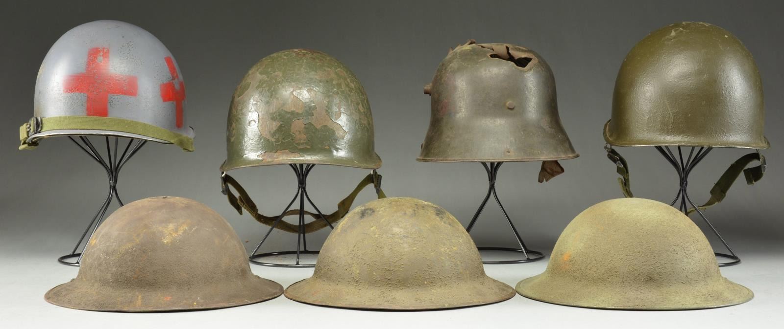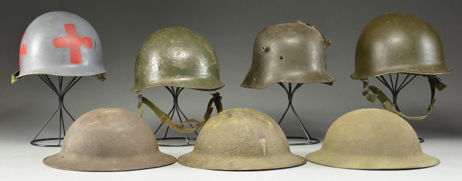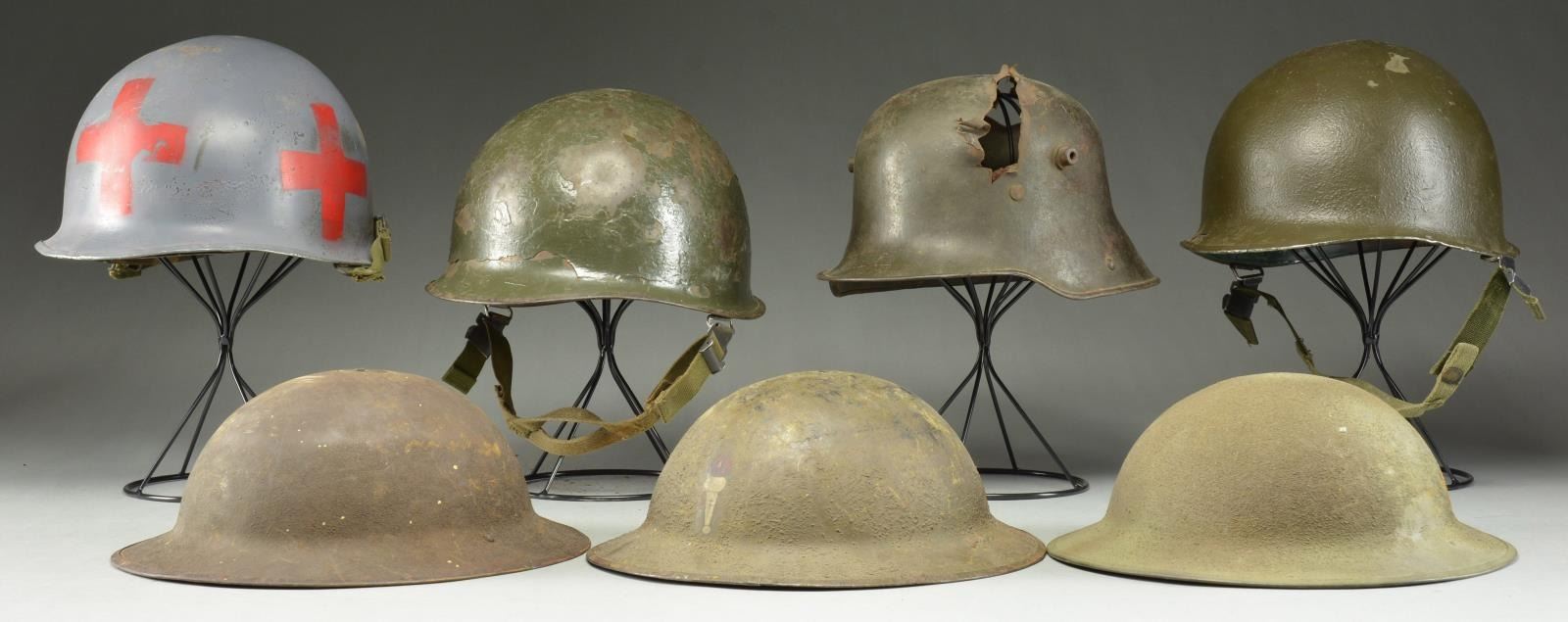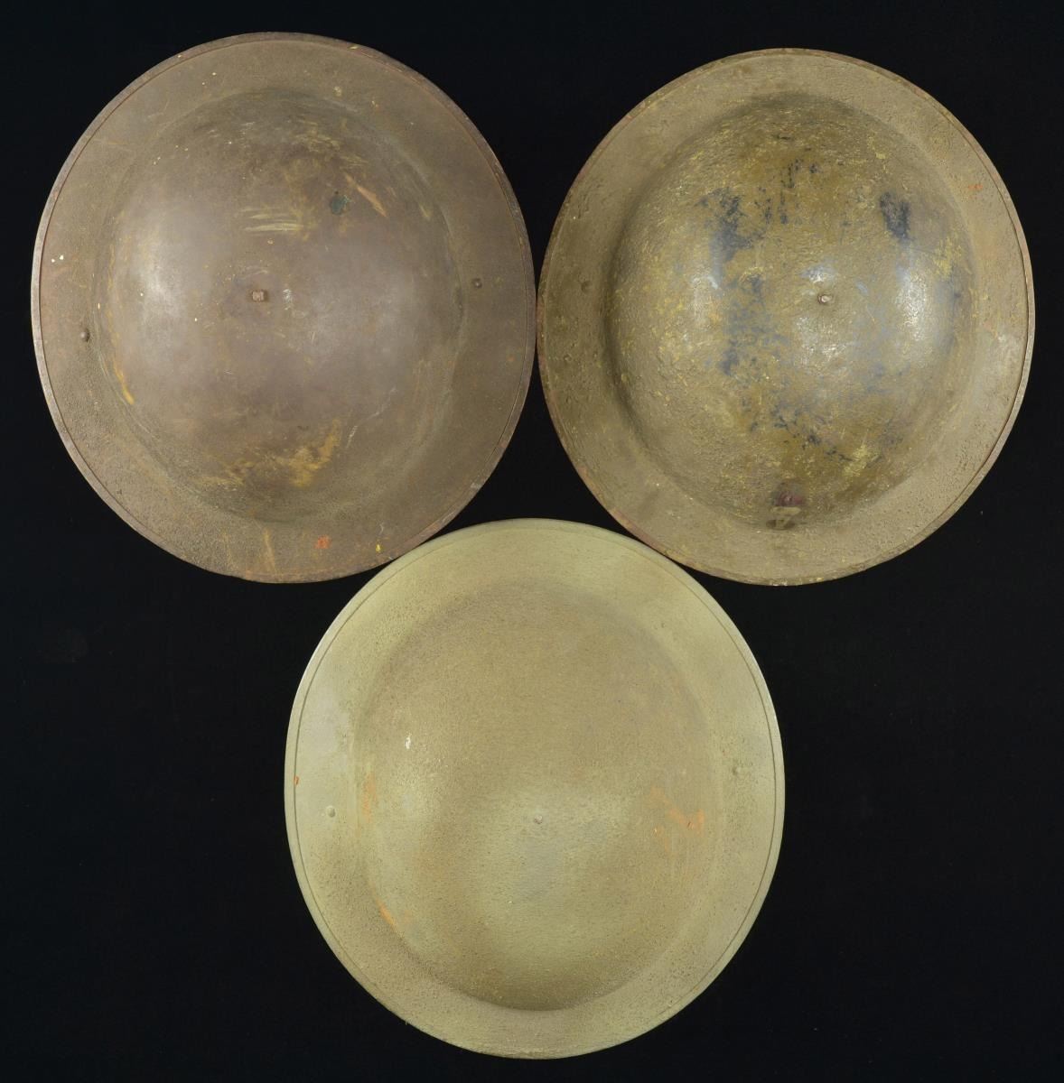 7) US: M1917 helmet shell. No liner or chin strap. Helmet has a dark partially sanded finish. CONDITION: moderate wear.