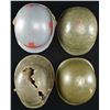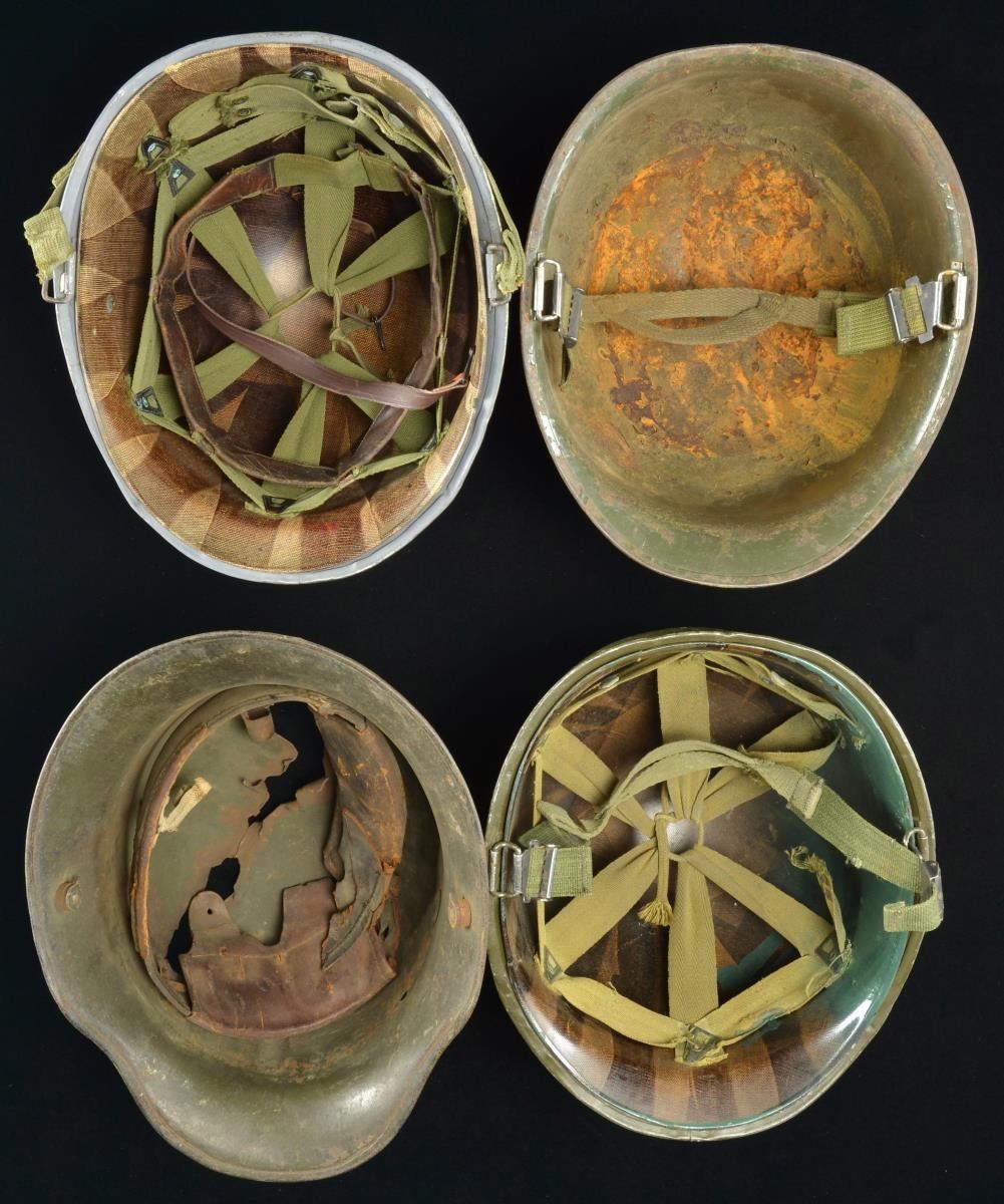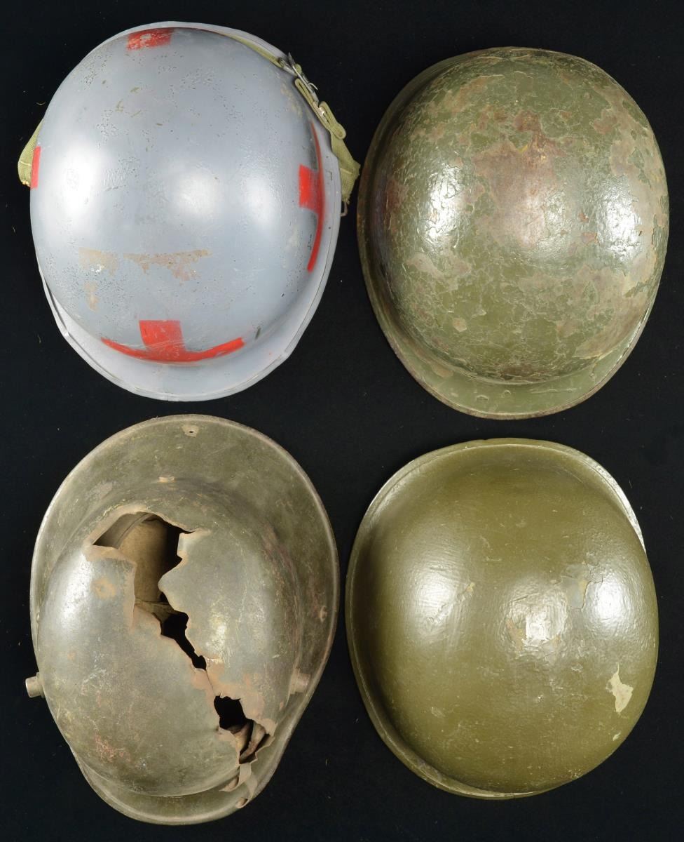 4) US: M1 front seam swivel bale helmet. Helmet has been painted gray in the period indicating Naval use. There are 4 red crosses around the helmet as used by Navy Corpsmen. Original WWII liner & chin strap. CONDITION: generally light wear overall.
