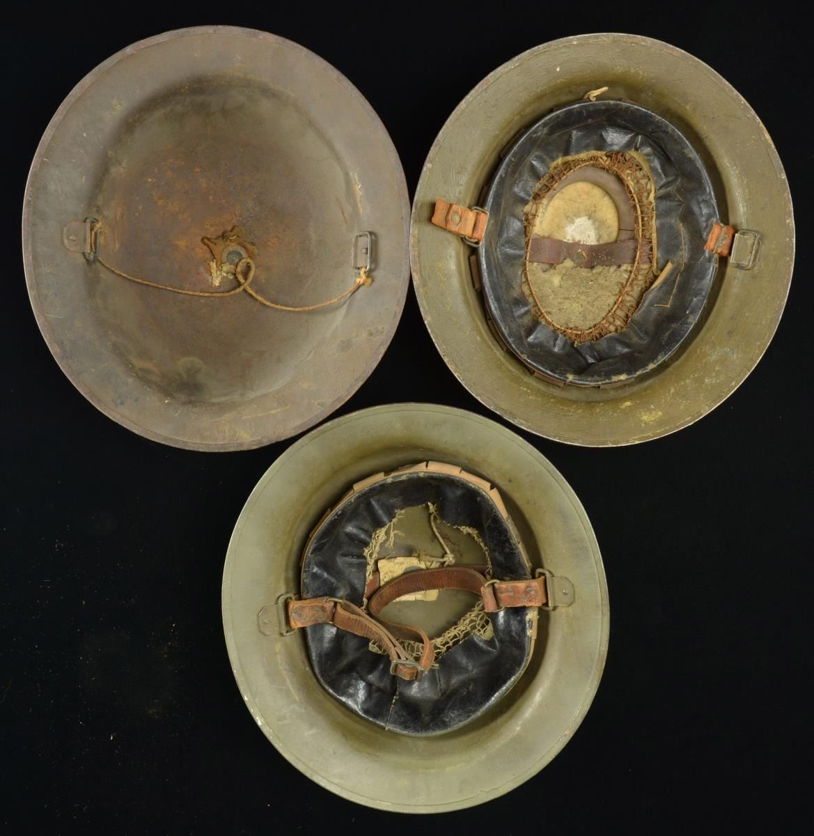 5) US: M1917 helmet with full liner & chin strap. Helmet has a green sanded finish. CONDITION: light wear overall.