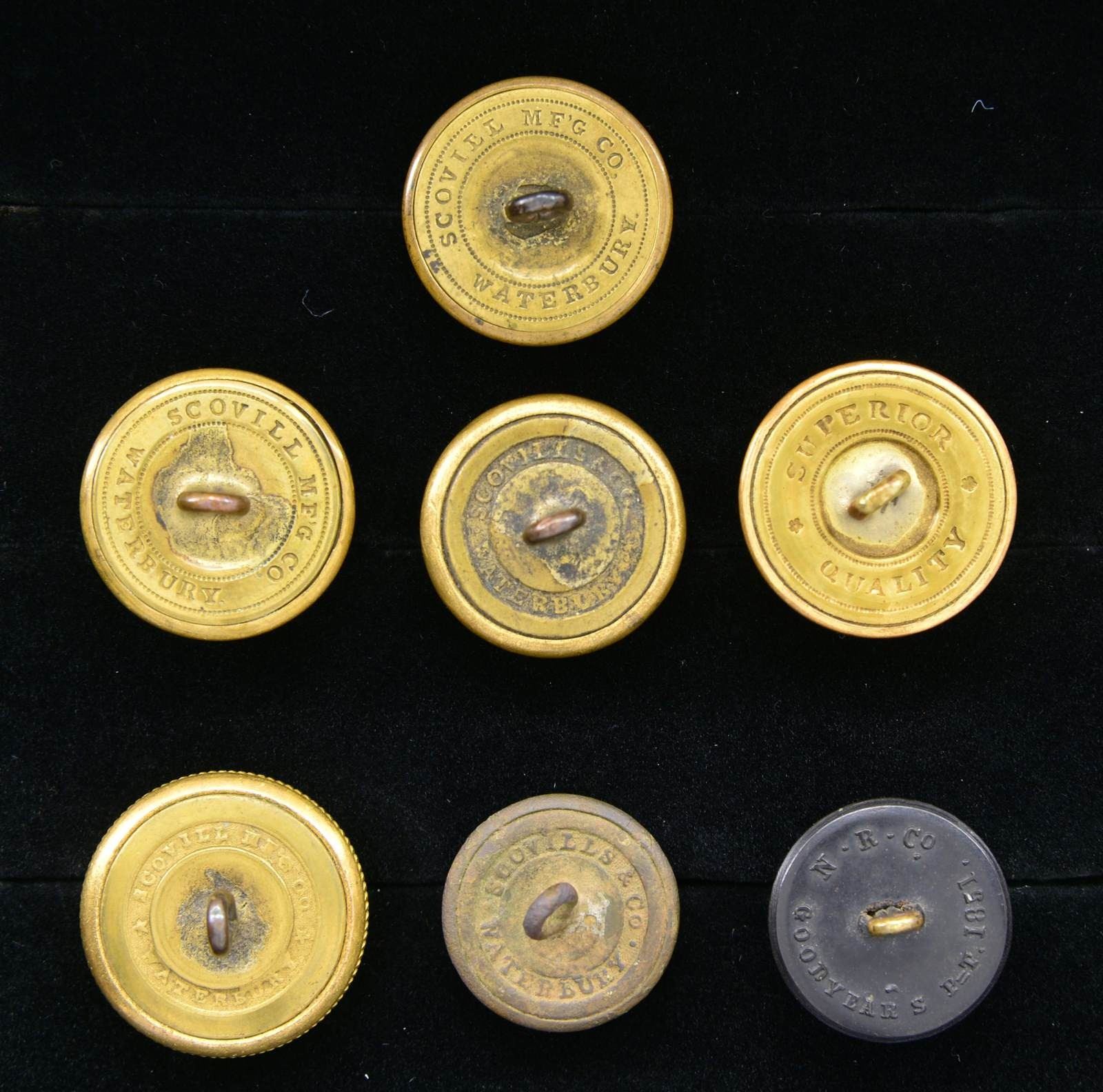 This group consists of 1 excavated VG-2-A dug at Fredericksburg, VA. / 1 Non excavated CF-1-A. / 1 Non excavated PA-18-A-type. / 1 Non excavated ME-1-A. / 1 Non excavated PA-46-A. / 1 Non excavated FD-6-A-type. / 1 Non excavated GI-95-A1. CONDITION: the eagle “V” is excavated but has a full straight shank. The other non excavated buttons have full shanks and a substantial amount of their gilded finish remaining. The sharp shooter buttons shows very light wear and has a full shank. (02-18116-1/BF). $1,300-1,600.