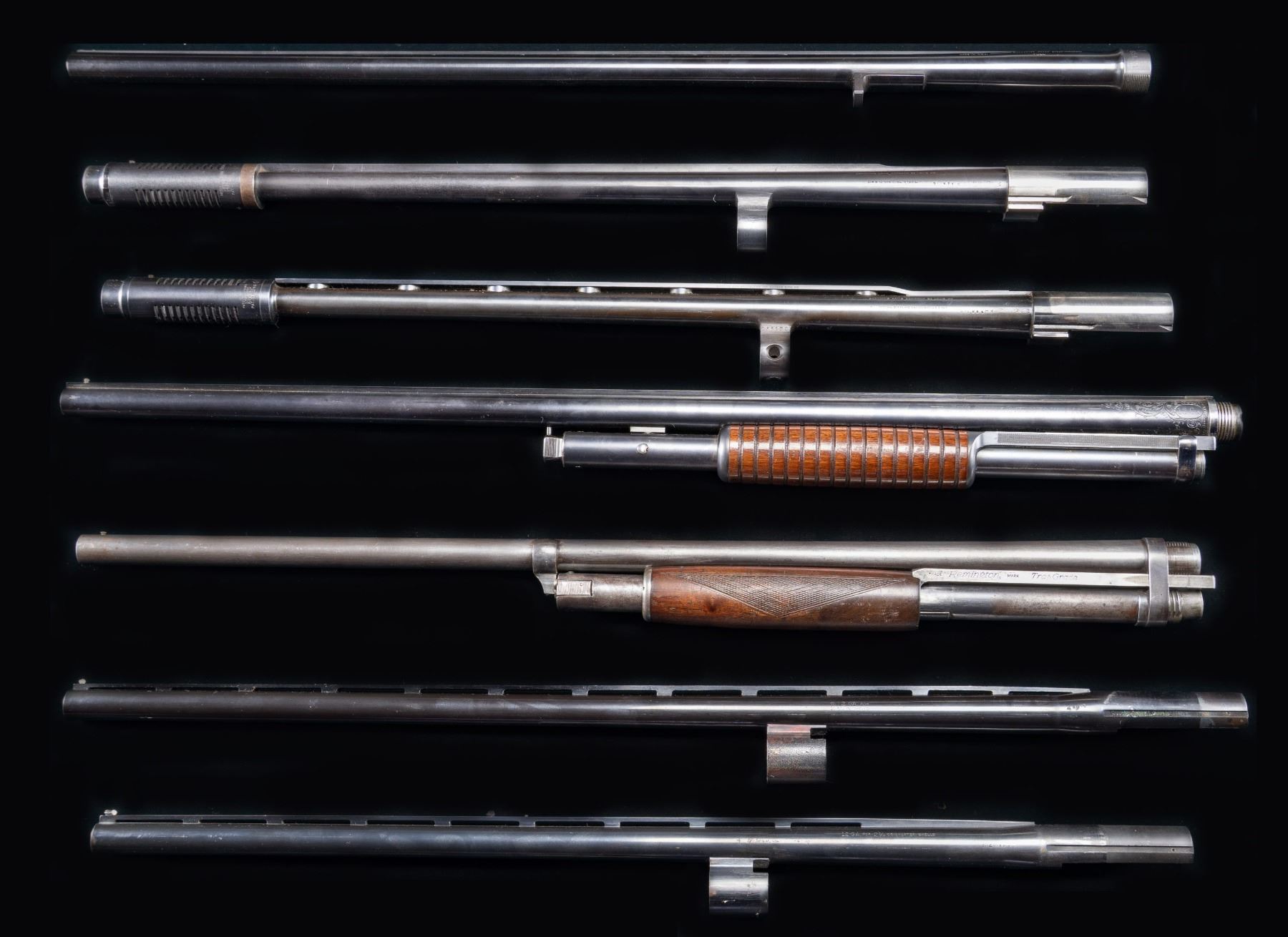 MARLIN AND REMINGTON. 1). WINCHESTER Model 50 VR of 29 3/4" having full choke. 12 Ga. 2 3/4" electro numbered 19758. Great, near excellent condition including bore. 2). BROWNING Auto 5 with solid rib and Lyman Cutts Compensator having Spreader tube; 26" overall. 12 Ga. 2 3/4" made in Belgium and numbered 193780. Good exterior with use and high point wear. Bore is near excellent. 3). BROWNING Auto 5 with Simmons 1/2" wide vent rib wih Lyman Cutts Compensator having Spreader tube; 26" overall. 12 Ga. 2 3/4" made in Belgium and numbered 255130. All aspects of condition are near excellent with faint firing residue. 4). MARLIN Model 24 complete assembly with magazine tube and forend. Numbered L765556 F having solid rib and in 12 Ga. Forend is grooved and round. Receiver end of 31 3/4" barrel has nice scroll engraving with shaded backgrounds. Not choke marked, but measures a tight modified. Condition is very good with light function wear and an occasional mark; near excellent bore. 5). REMINGTON Model 10 Trap Grade plain 30" barrel assembly to include magazine tube and checkered walnut forend. 12 Ga. 2 3/4" full choke with action bar marked "Trap Grade". Fair overall condition with considerable signs of use and almost no finish. Good, bright bore with faint frosted appearance near chamber. 6). REMINGTON Model 1100 with skeet choke in 12 Ga. 2 3/4" of 25 1/2" length having vent rib and Lyman white bead sight. Very good overall with some light marks, faint spots of peppery oxidation and very slight firing residue. 7). REMINGTON Model 1100 with modified choke in 12 Ga. 2 3/4" of 28" length having vent rib and white painted bead sight. Very good overall as refinished with some light marks, faint use marks and very slight firing residue. (02-25049/NW). NON-GUN. $350-500.