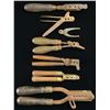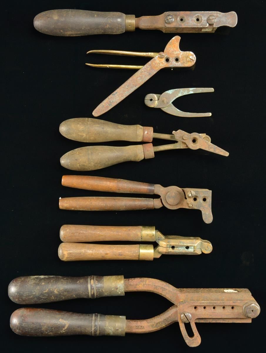 4 molds are brass, 3 iron, one marked “IDEAL”, the earliest style brass is 2 cavity mold for 46 caliber conical and round ball. The four iron molds are for small bore rifles. CONDITION: good overall, iron patina