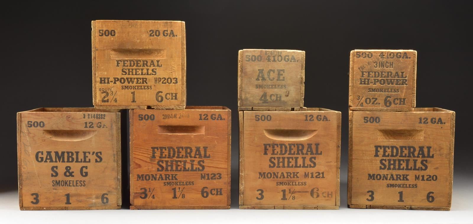 7 VINTAGE FEDERAL & GAMBLES WOODEN SHOTGUN AMMO