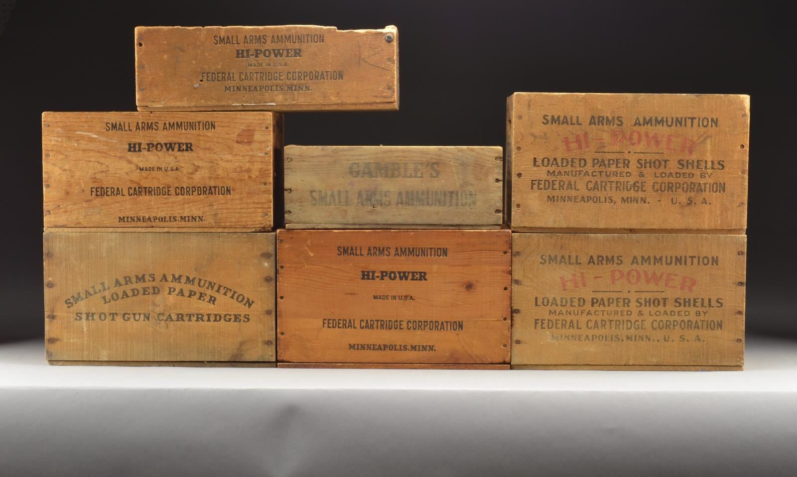 CONDITION: boxes in good to very good condition unless noted. Boxes exhibit moderate handling marks & wood splits. Markings on boxes appear visible along w/ other misc. marks. (02-16599-1/MD). $200-400.