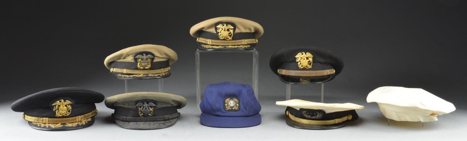 ARMY TRANSPORTATION SERVICE VISOR CAPS & MORE. This group of caps includes a dark green, Navy visor cap w/ officer’s insignia on the front. Black chinstrap w/ black side buttons & black visor. Inside sweatshield reads in part, “REGULATION US NAVY CAP”. The name, “William T Lightner, ENS. USNR” is mounted in the sweatshield. / A khaki naval officer’s cap w/ bullion insignia on the front. Visor has bullion oak leaves & acorns. Gold chinstrap. Interior sweatshield has a card that reads in part, “NATIONAL PRESS CLUB WASHINGTON DC C.E. ROGERS JR.”. / A white cap of Navy design w/ a bullion silver wreath on the front encompassing the letters, “A.T.S.” for the Army Transportation Service. Interior is marked, “THE BARANOF 67 YESLER SEATTLE”. / A Public Health officer’s visor cap w/ a black crown. Gold Public Health officer’s insignia on the front. Gold bullion & red chinstrap w/ Public Health officer’s side buttons. Interior is marked, “S.W. RICE”. / A Public Health officer’s visor cap w/ a khaki crown. Gold Public Health officer’s insignia on the front. Gold bullion & red chinstrap w/ Public Health officer’s side buttons. Gold bullion oak leaves & acorns on the visor. Interior is marked, “BANCROFT MILITARY CAPS”. / A Public Health officer’s visor cap w/ a black crown & spare white crown. Gold bullion Public Health officer’s insignia on the front. Gold bullion & red chinstrap w/ 1 Public Health officer’s side button. Gold bullion oak leaves & acorns on the visor. Interior is marked, “Art Caps New York”. / A blue Coast Guard Auxiliary ball cap w/ bullion & enamel insignia on the front. CONDITION: naval caps show light to moderate wear. Army Transport cap shows moderate wear w/ some rodent damage to the sweatshield. Public Health officer caps show very little wear. (02-15770/BF). $800-1,000.