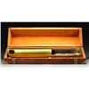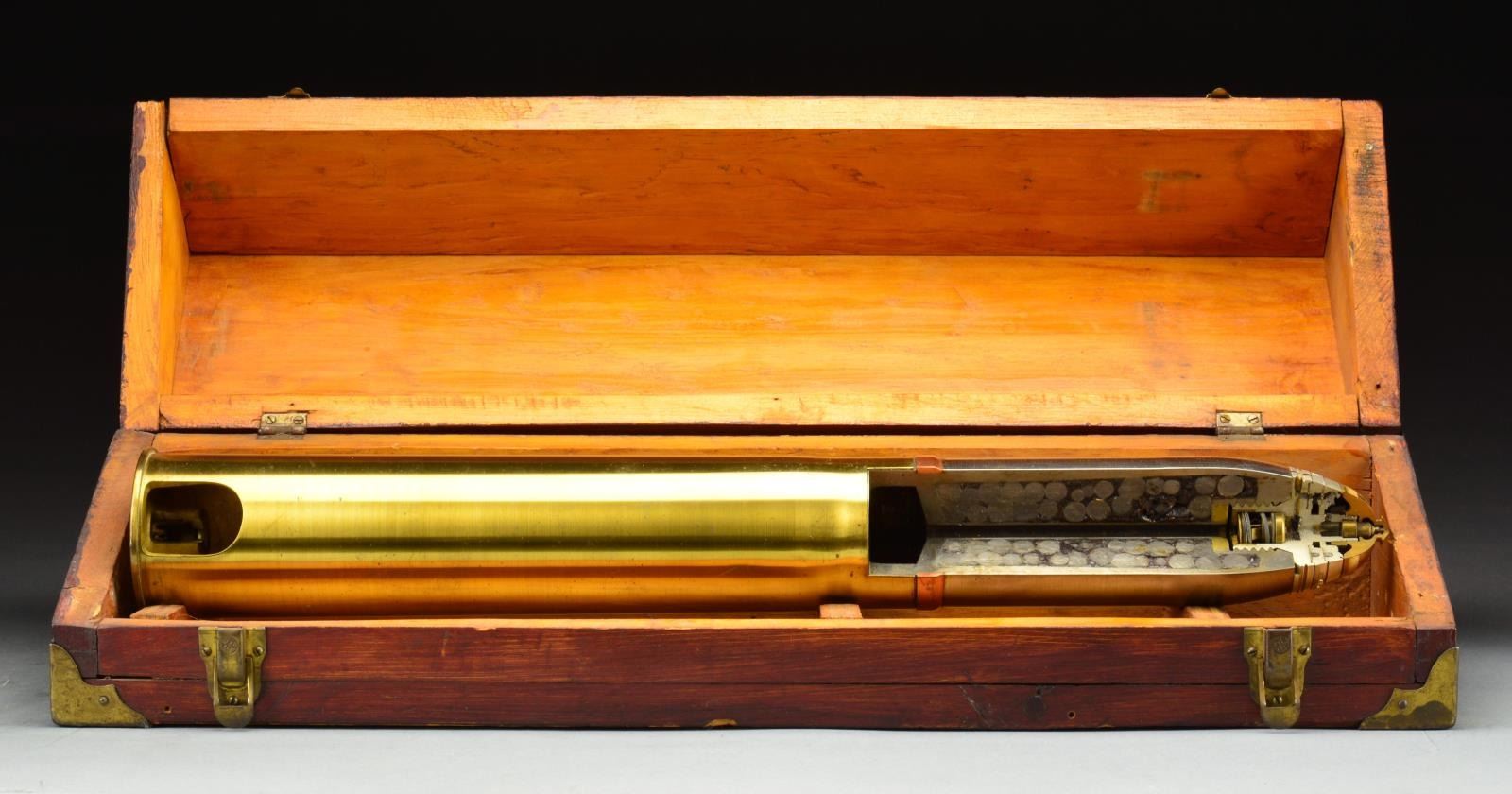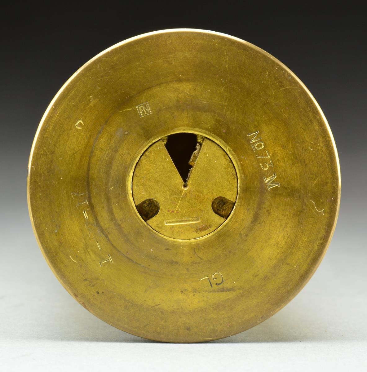 U.S. WWI ARTILLERY. Consignor states that the shell was presented to an executive of American Can Company. Shell is standard shrapnel loaded w/ approx. 290 lead balls. Ideally these would burst high above the ground & over the heads of enemy troops. Early in WWI, the shrapnel shell was the predominant type of ammo. for the French 75mm artillery piece, but by the end of the war, high explosive shells superceded almost all other ammo. types. The shrapnel shell was named for its developer; Lt. General Sir Henry Shrapnel. The term "shrapnel" has come to mean almost any type of fragmentation. The projectile is 75mm in diameter. The brass shell casing is 15 1/8" long. The overall length of the rd. is 24 1/2". The shell marked on the base w/ "1-22-17" "GL" "No. 73 M" & boxed "PN". Shell has fitted wooden case w/ brass colored reinforced corners. Brown finished case measures 26 1/2" x 7" x 6 3/4". Case has wear, scratches & hobby craftsman type workmanship. CONDITION: very nicely done cutaway showing all aspects of case & shell including the lead ball filling & details of the fuse. Shell has highly polished finish w/ scattered handling marks & peppery spots of oxidation. (02-15289/RW). $250-400.