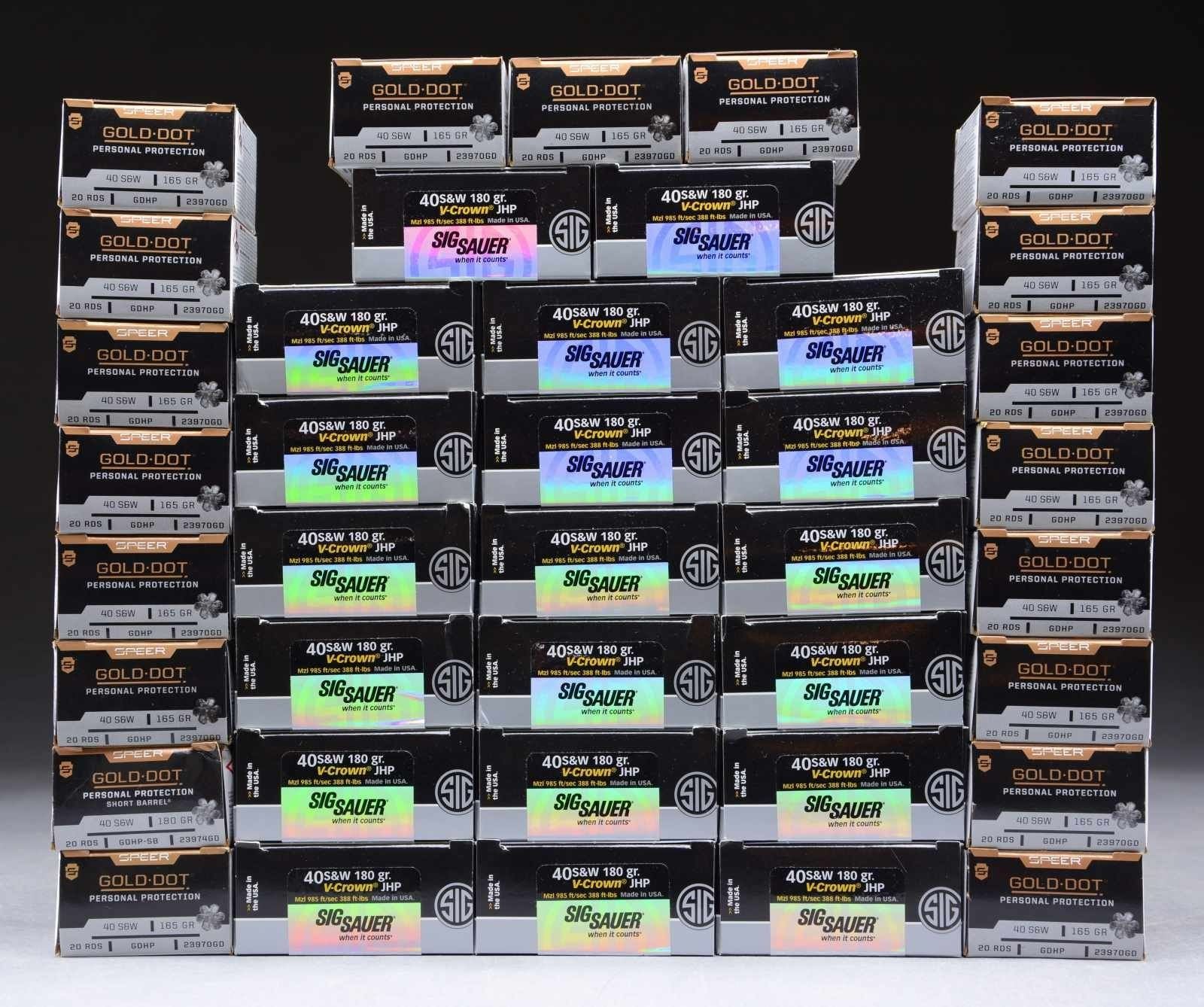 380 RDS. (19 BOXES) Speer Gold Dot 165 gr. GDHP. 400 RDS. (20 BOXES) Sig Sauer 180 gr. V-Crown JHP. CONDITION: boxes very good to near excellent; ammo appears serviceable. PROVENANCE: The Collection of Gun Sport Ltd owned by Jon R. Thomas. (02-20400/MD). $250-400.