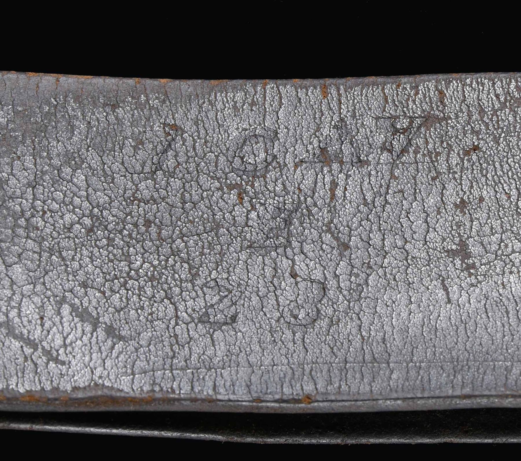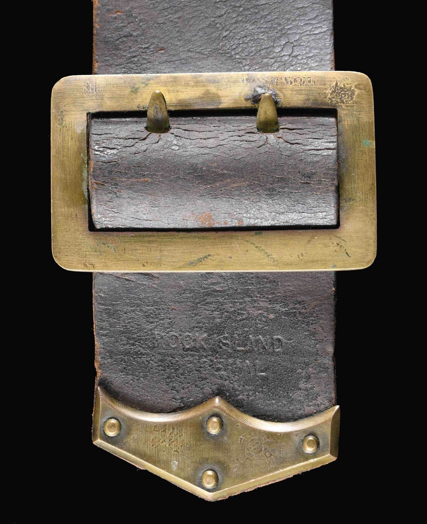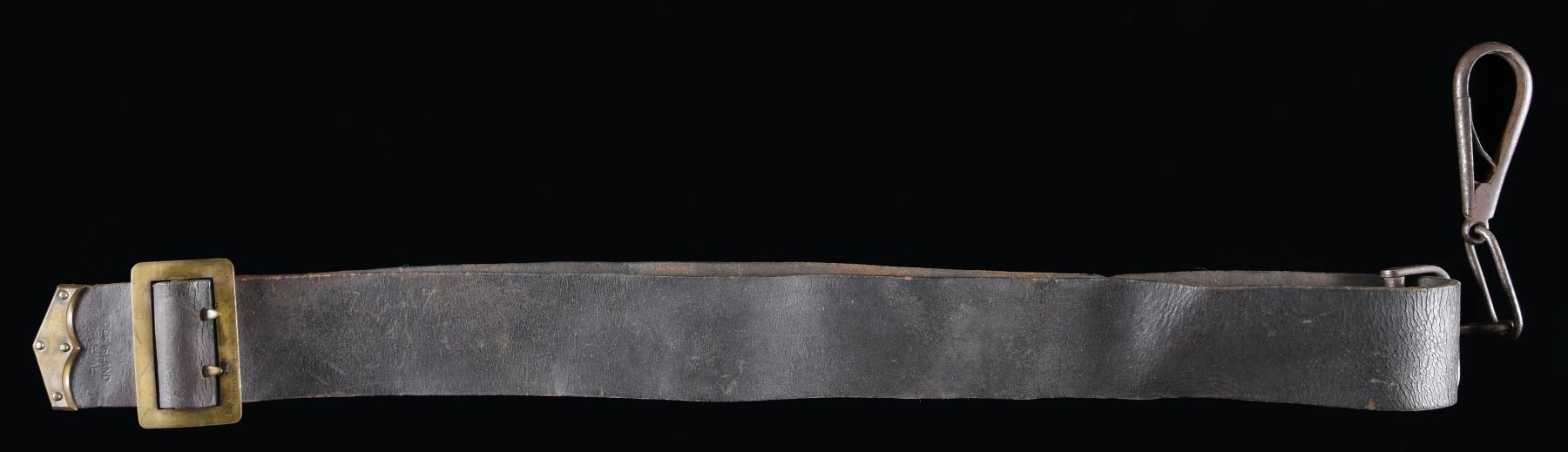 56" overall, standard Civil War era 2.25" wide strap, brass tip & buckle, spring loaded iron carbine clip. "ROCK / ISLAND / ARSENAL" stamped above tip, "7 CAV / E / 23" emboss stamped about 8" from tip. Originally during Civil War these straps were longer and had sewn on buckles, later riveted. CONDITION: good overall, 1" cut. (02-24564/JS). NON-GUN. $600-800.