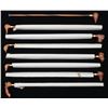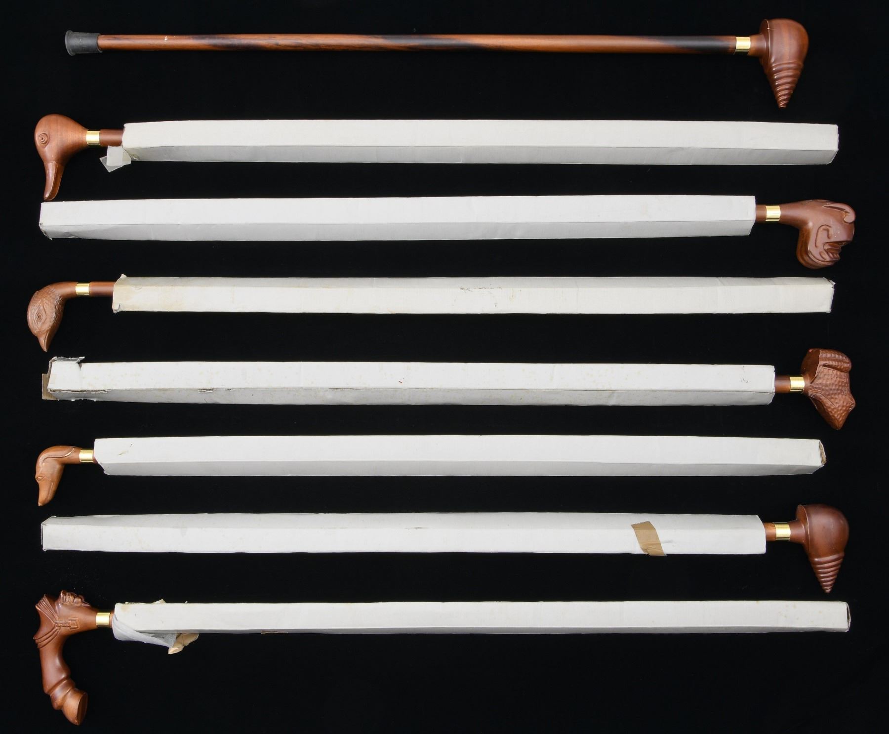 DRAKE. These carved wooden walking sticks average 36" in length and have a rubber tip at the base. The heads are carved to represent a duck head, a bulldog head, a pheasant head, a horse's hoof, a dog head, a frog, and a sea shell (2). Below the hand piece is a 5/8" gilded ferrule. CONDITION: items are new but show some scuffs and scrapes from storage wear. PROVENANCE: from the renowned collection of quality sporting arms from Lewis Drake together with inventory of Lewis Drake Associates. (02-23565-12/BF). $250-500.