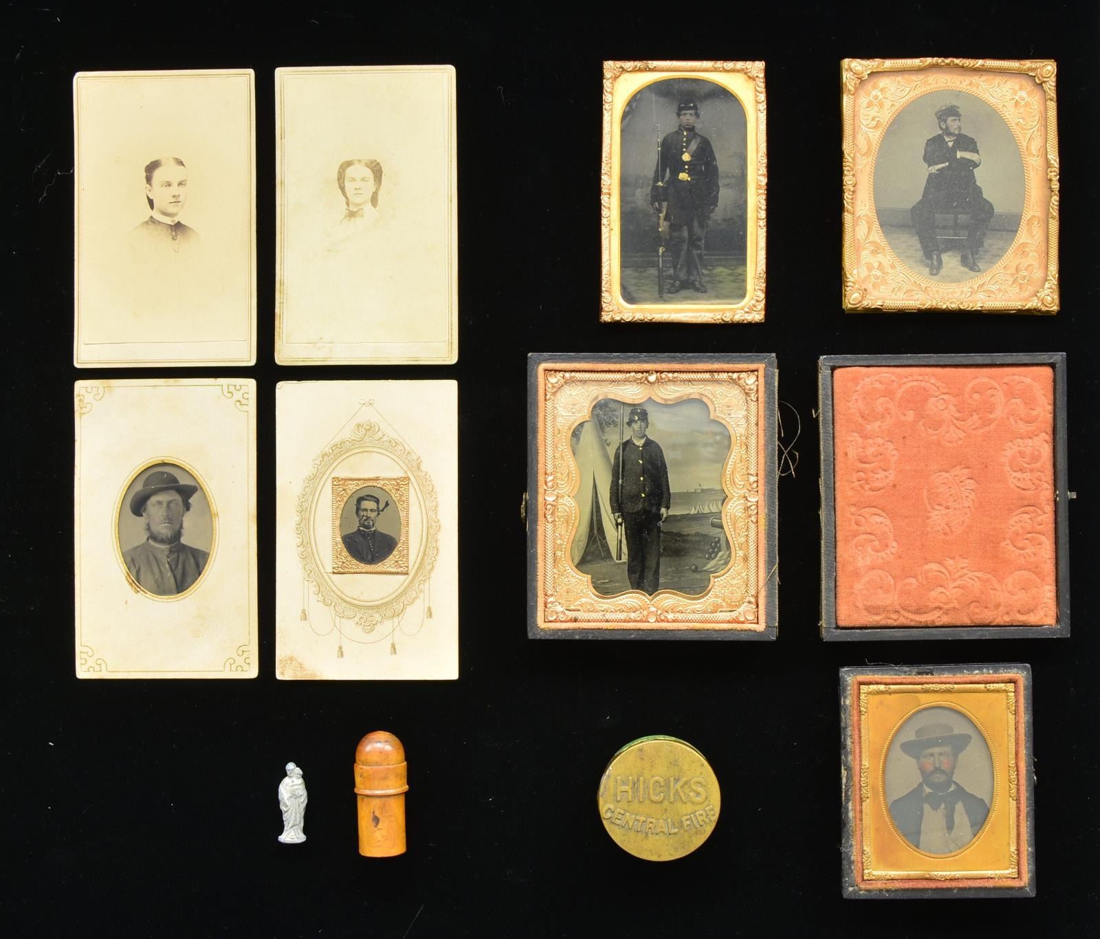 8 CIVIL WAR PERIOD PHOTOGRAPHS, A CAP TIN &