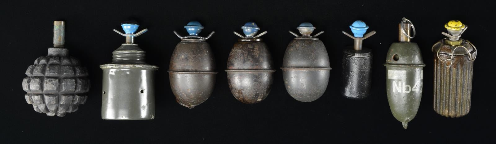 Lot includes: 1 WWI Kugelhandgranate. / 3 M39 w/ blue painted BZE fuses. / 1 Steilhandgranate head w/ BZE fuse w/out stick handle. / 1 Model 1945 iron grenade w/ BZE fuse. / 1 Nb 42 smoke grenade w/ 1929 type fuse & 1 unmarked grenade w/ BZE style fuse. CONDITION: fair to good overall w/ handling marks, dents, pitting & oxidation. (02-16255-1/MD). $400-600.