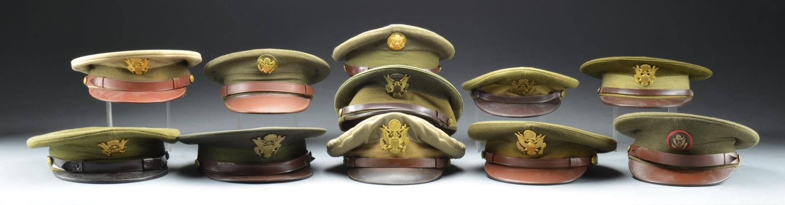 HATS. An excellent group of WWII Army visor caps consisting of a khaki hat of a crush pattern w/ gilded officer’s eagle on the front w/ brown chin strap & visor & an additional buckled chin strap around the back of the hat by Luxenberg. / A green hat w/ officer’s gilded eagle on the front, dark brown visor & chinstrap by Heiberger. / A green hat w/ officer’s gilded eagle on the front, dark brown visor & chinstrap & engineer side buttons. / A green hat w/ officer’s gilded eagle on the front, dark brown visor & chinstrap by Sanderman. / A green hat w/ officer’s gilded eagle on the front, dark brown visor & chinstrap. / A green hat w/ officer’s gilded eagle on the front, dark brown visor & chinstrap w/ a card on the inside that reads, “DAVID M ROSS LIEUTENANT, CAVALRY”. / A khaki hat w/ officer’s gilded eagle on the front, dark brown visor & chinstrap by Morans. / A green hat w/ officer’s gilded eagle on the front that has a ribbon above that reads, “PEEKSKILL”. Hat has a dark brown visor & chinstrap & is made by Jacob Reed’s Sons. / A green hat w/ enlisted gilded round eagle insignia on the front. Hat has a dark brown visor & chinstrap. / A green hat w/ enlisted gilded round eagle insignia on the front. Hat has a dark brown visor & chinstrap. / A green hat w/ enlisted gilded round eagle insignia on the front backed by a red disk. Hat has a dark brown visor & chinstrap & an additional buckled chinstrap around the back. CONDITION: all hats show light wear & are generally in fine condition. (02-15768/BF). $800-1,100.