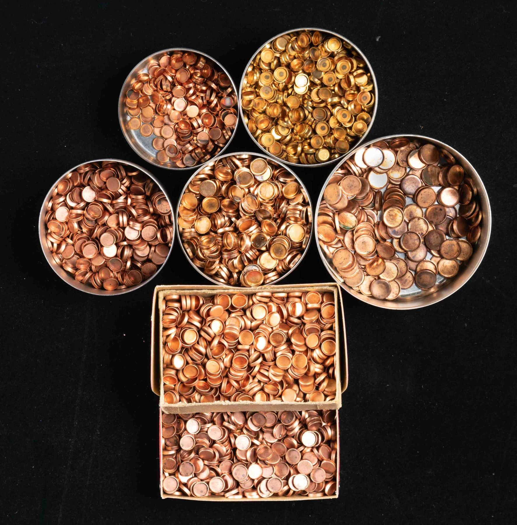 1 - Tin of Hornady 44 cal. appears less than 1/4 full; some gas checks show verdigris. CONDITION: tins are good intact showing patina; 44 cal tin has detached label. Unless stated; gas checks appear very good. PROVENANCE: Norman Olliff Estate. (02-25679/MD). NON-GUN. $20-40.