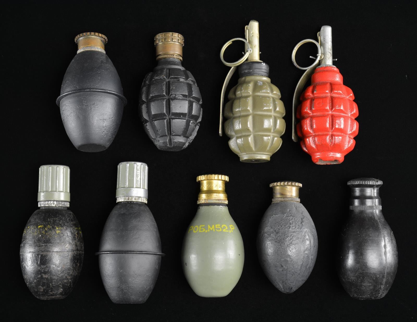 YUGOSLAVIA: 1 WWII M35 fuse on a F1 "pineapple" style body. / 2 WWII M38 fuses on 1 iron & 1 sheet metal body. / 1 M50 fuse on green painted M52 cast iron body. / 2 M69 fuses on 1 iron & 1 sheet metal bodies. / 1 M38 style solid rubber trainer.