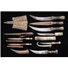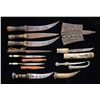 This interesting lot contains 3 knives measuring approx. 13" in length that fit into one 3-slot sheath. The curved knives have blades about 8 1/4" long with what appear to be Arabic symbols etched into the blade. The hilt is wood and measures approx. 4 1/2". / 1 Far East knife resembling a tanto, measuring 10 1/2", with a plain blade. The grip and sheath are engraved bone featuring three Asian people with numerous geometric and decorative designs. / 1 Straight-blade knife measuring 10 1/2" with a carved wooden grip. / 2 Straight-blade knives measuring 8 3/4", with bone and brass washer grips and matching leather sheaths. / 1 Moroccan-type koumya, measuring 10 3/4" overall, with a carved wood, bone, and antler grip. The curved 5 3/4" blade has lightly engraved decorative symbols. The sheath has a repousse-decorated brass covering. / 1 Small Moroccan-type koumya measuring 8 1/2" overall, with a small, nearly straight 4 1/2" blade. The hilt and sheath are silver-plated and have similar decorative motifs. CONDITION: knives generally show moderate wear. Larger koumya shows heavy wear, as does the larger straight-blade knife. (02-23412/BF). $200-400.