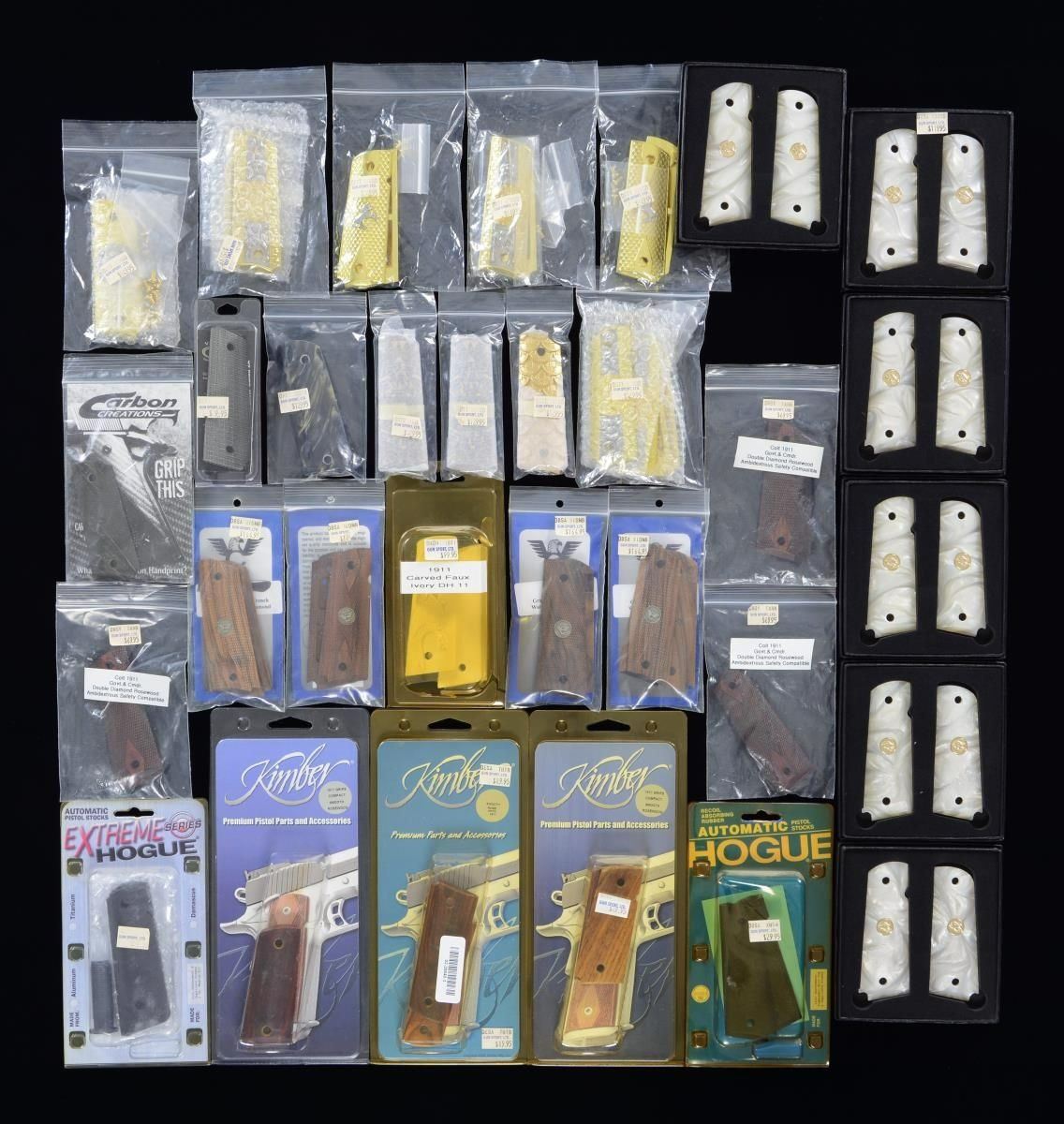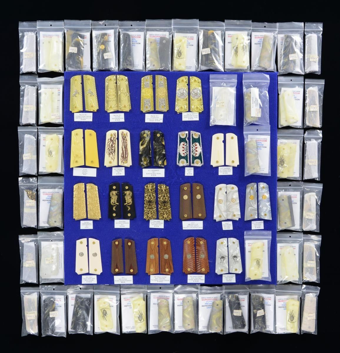 BOARD. Most are by NC Ordnance (simple bag packaging & occasional branded part numbers) plus some by other manufacturers or factory. MODEL 1911 & OFFICERS: Display board containing 19 sets for Model 1911's and 1 set for Officer's Model. MODEL 1911: 6 boxed simulated pearl, 2 simulated pearl etched with Grim Reaper image, 1 faux carved ivory, 2 Chinese Feng Shui with Lucky Coin scales, 9 Aztec Calendar black / gold, 4 faux stag, 3 checkered double diamond wood suitable for ambidextrous safety, 9 marbled black and gold simulated pearl, 1 marbled black and gold simulated pearl with gold Colt medallion, 4 Wilson Combat checkered double diamond, 1 VZ Grips slim checkered grey carbon fiber, 2 gold cast metal checkered double diamond with silver rampant Colt plus 4 gold screws, 1 Big Cat gold cast metal Versace style for ambidextrous safety with 4 gold screws, 2 Big Cat gold and silver with 4 gold screws, 1 Hogue Magrip 3 piece set to include flat checkered mainspring housing, 1 Hogue textured rubber grip set, 1 Kimber smooth Rosewood, 4 Big Cat gold and silver single right panels only (1/2 sets) plus 8 gold screws. OFFICERS: 9 simulated pearl having marbled rose tones, 7 simulated pearl etched with Grim Reaper image, 5 simulated pearl with minimal marbling, 1 Carbon Creations slim checkered double diamond, 2 Kimber Compact smooth rosewood. PROVENANCE: The Collection of Gun Sport Ltd owned by Jon R. Thomas. (02-20840-3). $2,000-3,000.