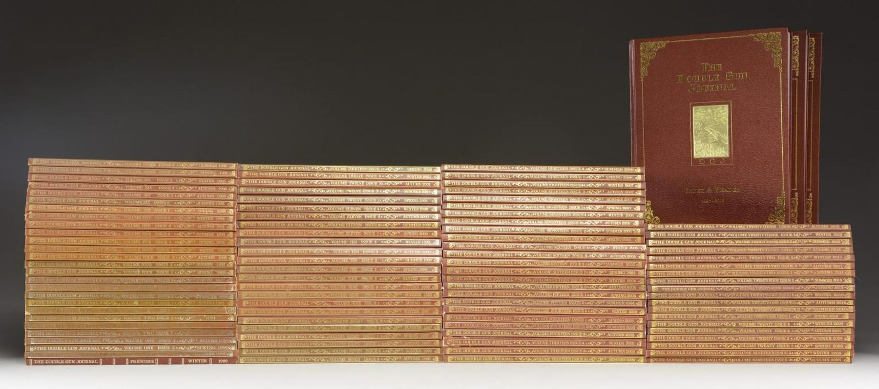 READERS. - 99 Double Gun Journals from 1989 through 2013. Missing volumes include 2011 Issue 2, 2013 issue 3 & 2013 Issue 4 Duplicates include volumes 1 for 1997 & Vol. 3 for 1992. - The Premier issue is signed # 1033 of 2824 signed by Daniel Philip Cote, founder of Double Gun Journals. - 2 copies of the 1990-1996 Index & Reader #589 & #590 signed by Daniel Philip Cote. - The 1997-2005 Index & Reader signed by Daniel Philip Core. CONDITION: balance of journals are in good to very good condition w/ light wear & fraying. Some volumes show water damage. (02-20976/MD). $400-800.
