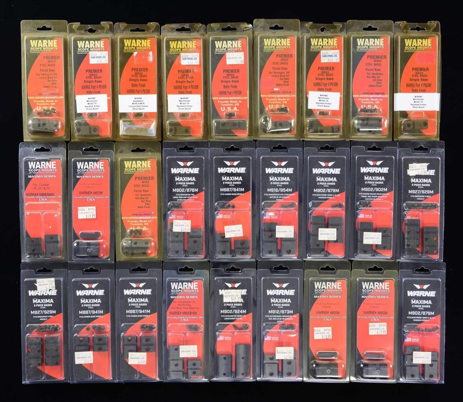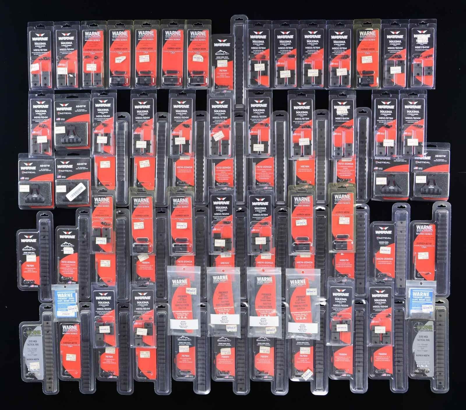 ADAPTERS. All items are new in factory packaging. MAXIMA 2-PIECE: 2 Browning X-Bolt M927/929M, 1 Cooper M898/848M, 5 Ruger American & Savage round receiver M902/902M, 4 Weatherby MK V 9 lug M902/879M, 5 Kimber 8400 M887/841M, 4 Remington 700 (8-40 screws) M912/873M, 6 Remington 700 (plus Howa 1500 & Weatherby Vanguard) M902/876M, 1 Winchester Model 88 & 100 M902/902M, 1 Winchester Pre-64 Mag. M902/818M, 4 Winchester (8-40 screws) M916/954M, 7 Winchester Model 70 M902/924M. MAXIMA 1-PIECE: 6 Ruger Mini-14 Ranch (plus others of same style) Picatinny adapter A971M, 5 Remington Model 700 LA (8-40 screws) 7672-20MOA, 2 Remington Model 700 LA M674M, 4 Remington Model 700 LA M674-20MOA, 5 Winchester Model 70 LA 7676M, 5 Savage round receiver 7666M, 3 Savage LA round receiver M667M. PREMIER PAIRED: 2 Weatherby non magnum P888/875M, 2 Remington Model 700 P902/879M. PREMIER WINCHESTER MODEL 70 SINGLES: 2 Standard Action Extended rear P904M, 1 Standard Action rear P924M, 2 Magnum Action rear P804M, 2 Magnum Action rear P878M, 1 Standard Action front P918M. PREMIER REMINGTON: 1 Model 700 rear P876M. ADAPTERS: 4 Picatinny 45 degree side mount A645TW, Side Mount Adapter #A645TW, 12 Picatinny side mount A600M. PROVENANCE: The Collection of Gun Sport Ltd owned by Jon R. Thomas. (02-20856-6/NW). $1,000-1,500.